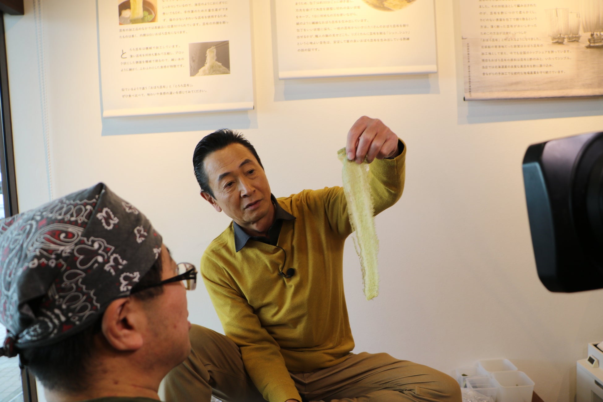 【おぼろや】では特産品の≪おぼろ昆布の手すき≫を体験!三田村の腕前に職人さんからお褒めの言葉が。スタッフ全員がソムリエだという酒店も訪れます。