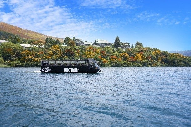 忍術のひとつとして有名な「水蜘蛛の術」。隣接する箱根園には「水蜘蛛の術」が体験できるアクティビティ『水陸両用ニンジャバス』があります。芦ノ湖にダイブする瞬間のワクワクをお楽しみください。また、芦ノ湖から見る箱根外輪山と富士山を望む絶景は息をのむ迫力と美しさです。秋ならではの箱根の紅葉もお楽しみください。