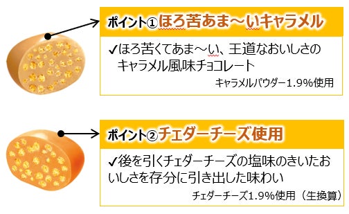 - ほろ苦くてあま~いキャラメル風味と、チェダーチーズの塩味のきいたチーズ風味のチョコレートを合わせました。