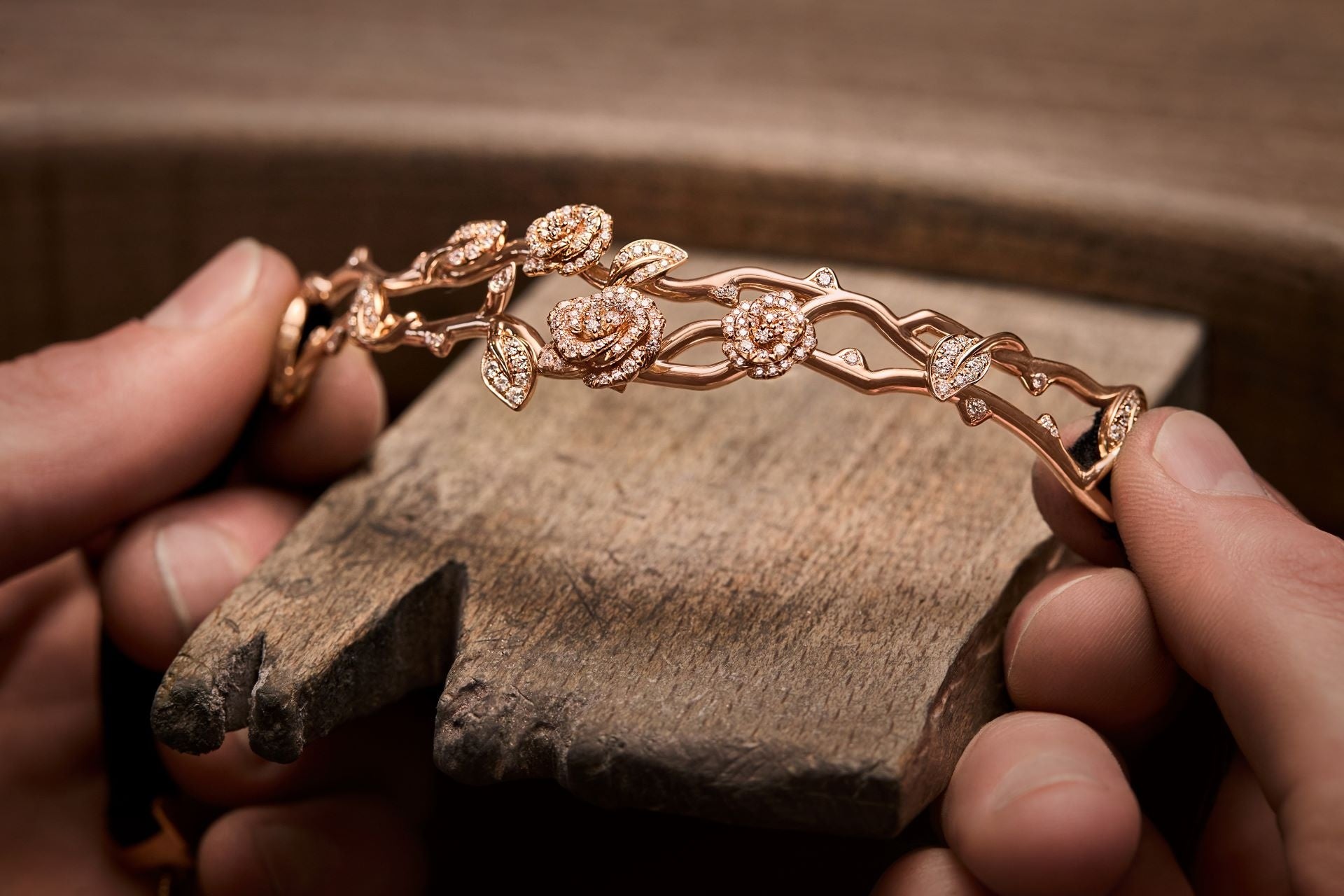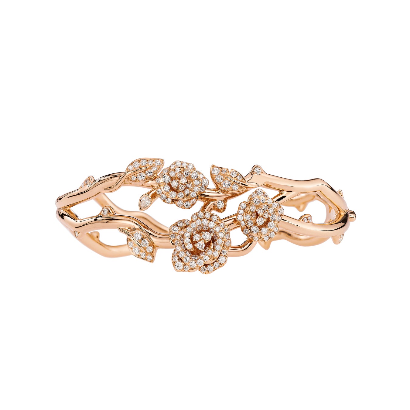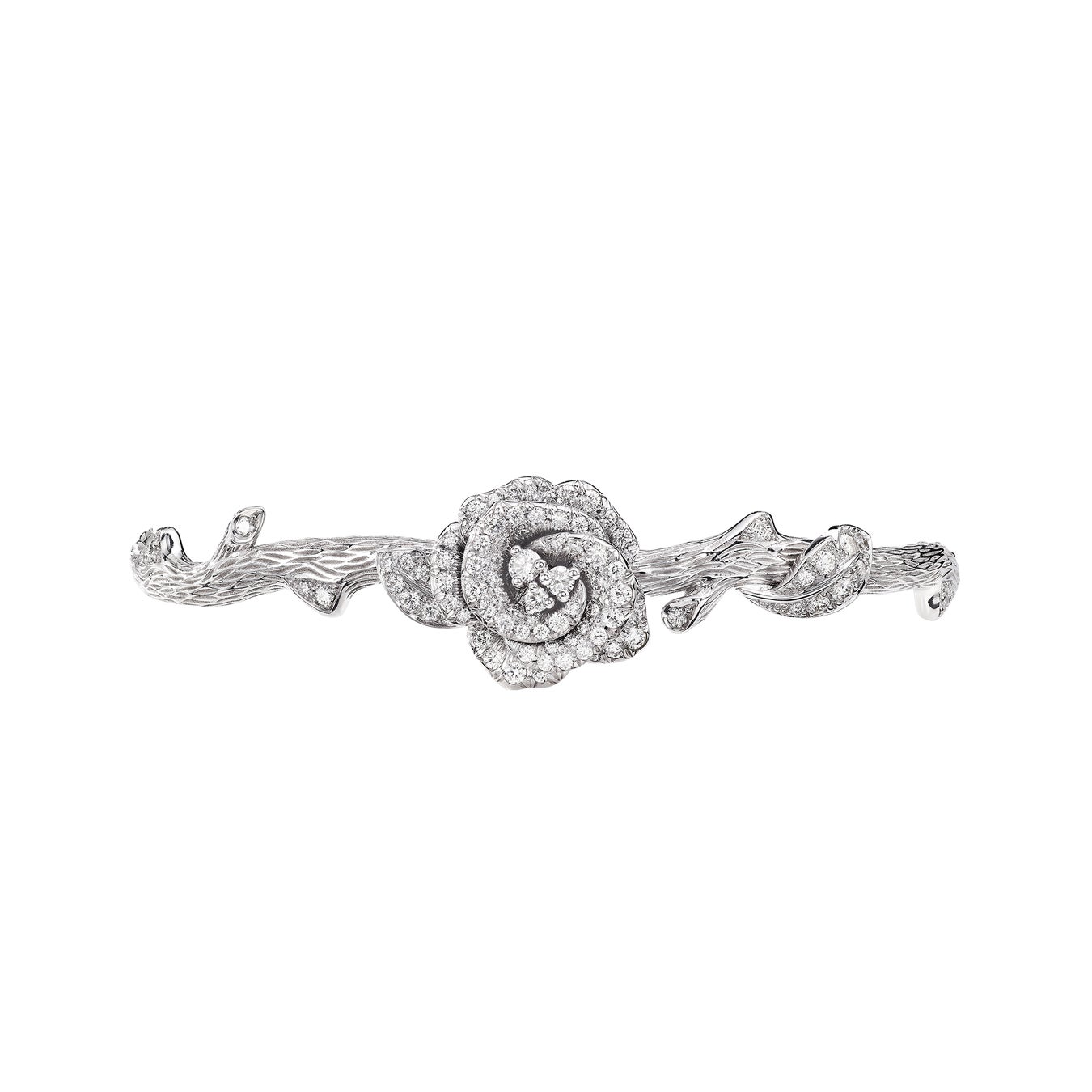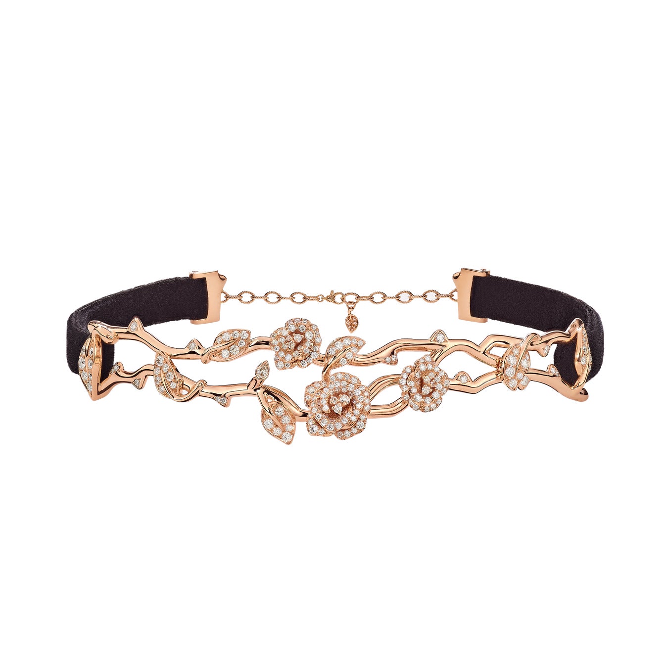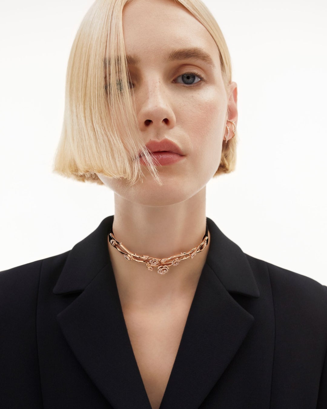 薔薇の花の花弁を豊かに表現した「ローズ ディオール バガテル」に新たに加わるのは、ピンクゴールドを用いたチョーカー、ブレスレットとリングです。ブラックベルベットのリボンと組み合わせたチョーカーは、装いに華を添え、大胆、かつ、今までにないスタイリングをお楽しみいただけます。