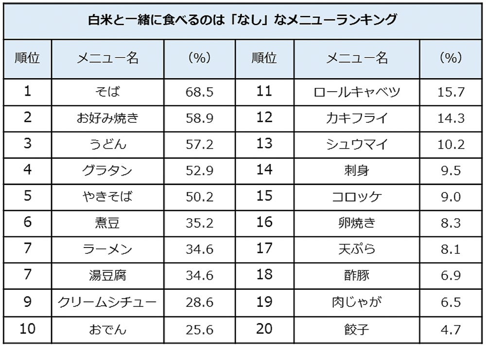 「お好み焼きに白米はありか?なしか?」。インターネット上でも議論を呼ぶことが多い「〇〇に白米はありか、なしか」について、『ホットペッパーグルメ外食総研』がピックアップした20メニューを調査したところ「なし」が最も多かったのは「そば」(68.5%)でした。2位「お好み焼き」(58.9%)が続き、5位「やきそば」(50.2%)、同率7位「ラーメン」「湯豆腐」(34.6%)も上位となっています。また、地域によって数値に特徴があることが分かりました。