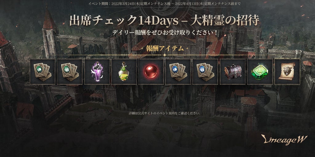 デイリー報酬として「夢幻の島の時間補充石(1時間)(刻印)」が、また14日間の日別出席報酬アイテムとして「大精霊の高級変身ガチャ11回(イベント)」や「血盟インシグニア強化の巻物(刻印)」などが獲得することができます。