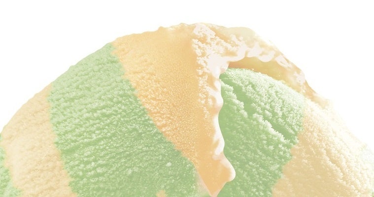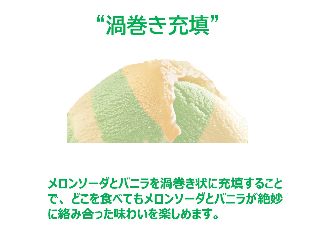 - メロンソーダとバニラの絡み合った味わいが楽しめるように「渦巻き充填」を採用しています。