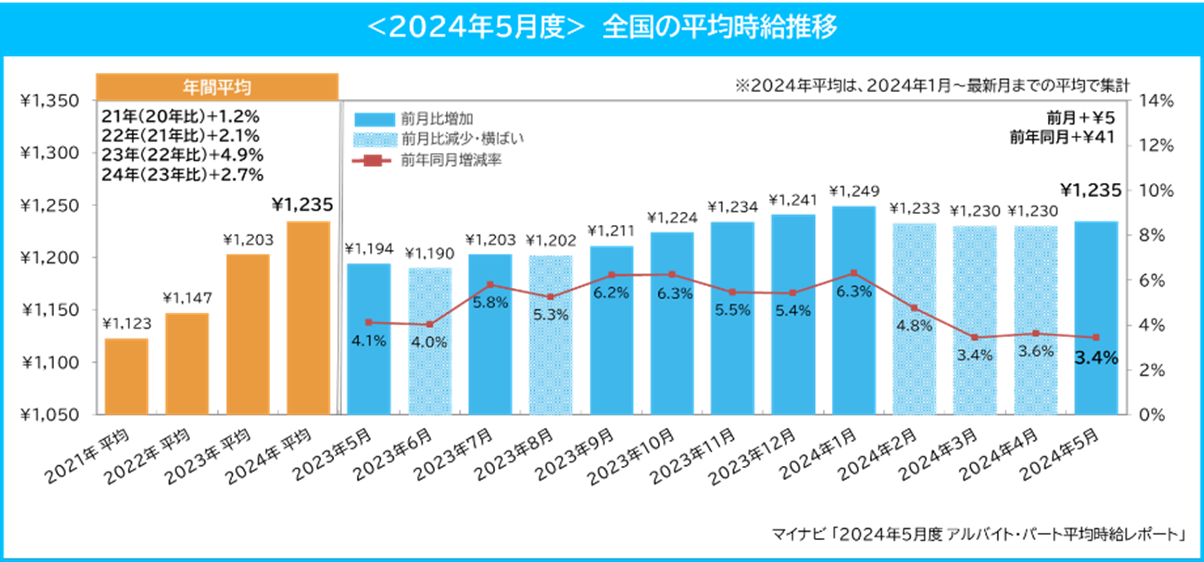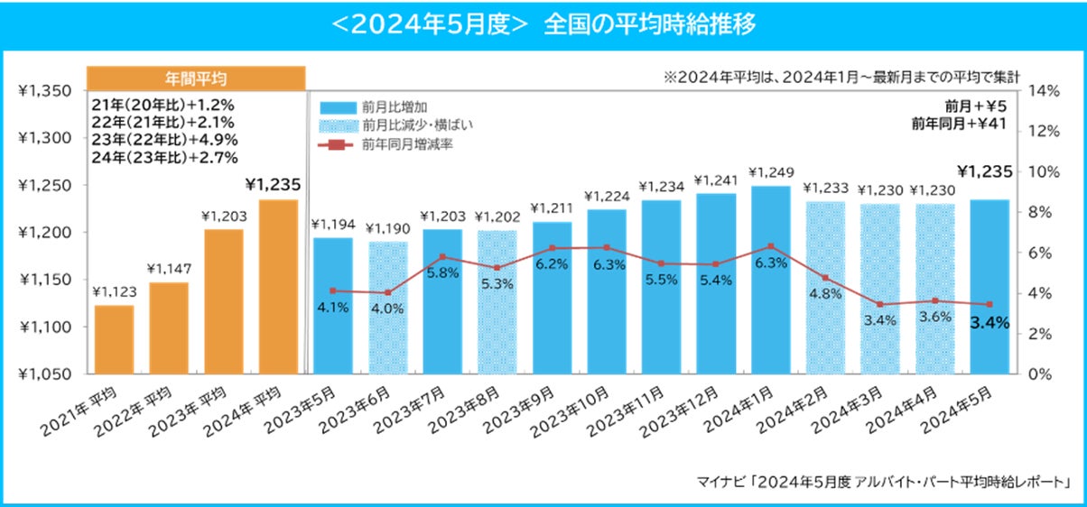 2024年5月の全国平均時給は1,235円(前月比:5円増、前年同月比:41円増)。前年同月比は21カ月連続で増加となった。