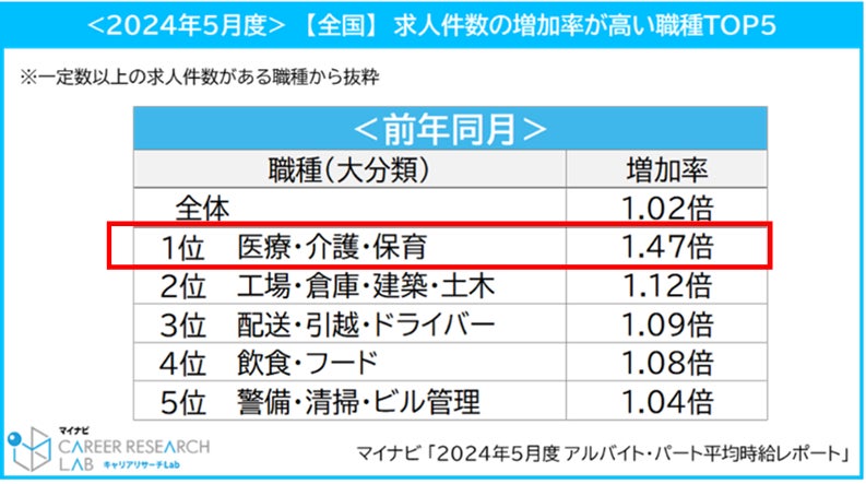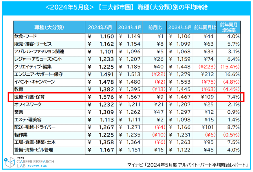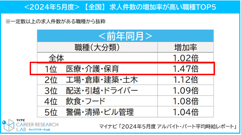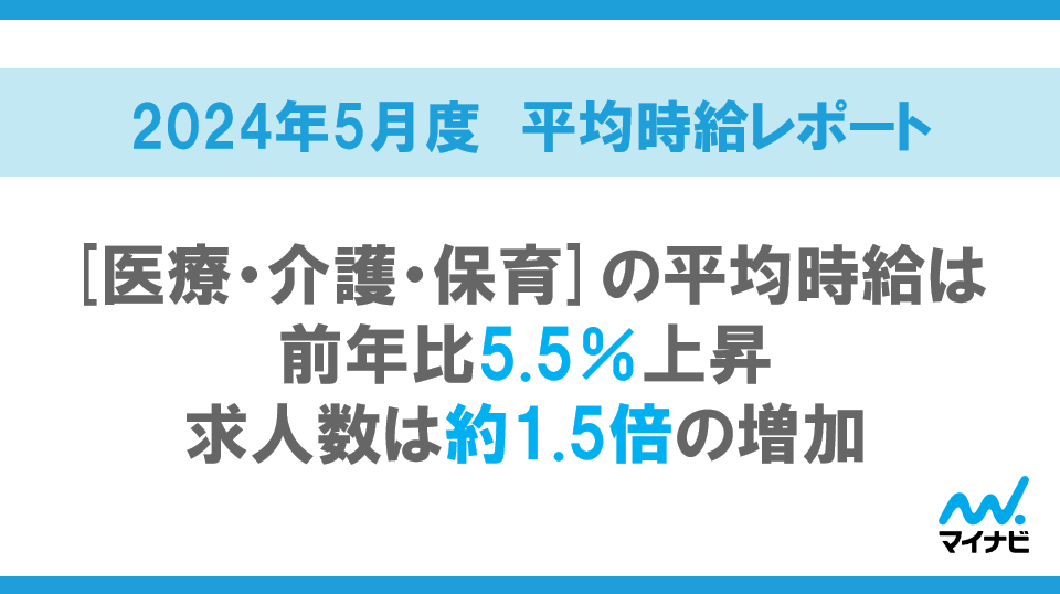 2024年5月の全国平均時給は1,235円。[医療・介護・保育]の平均時給は前年比5.5%上昇、求人数は約1.5倍の増加。医療従事者の賃金待遇改善の動きに伴い、アルバイト時給にも影響か。