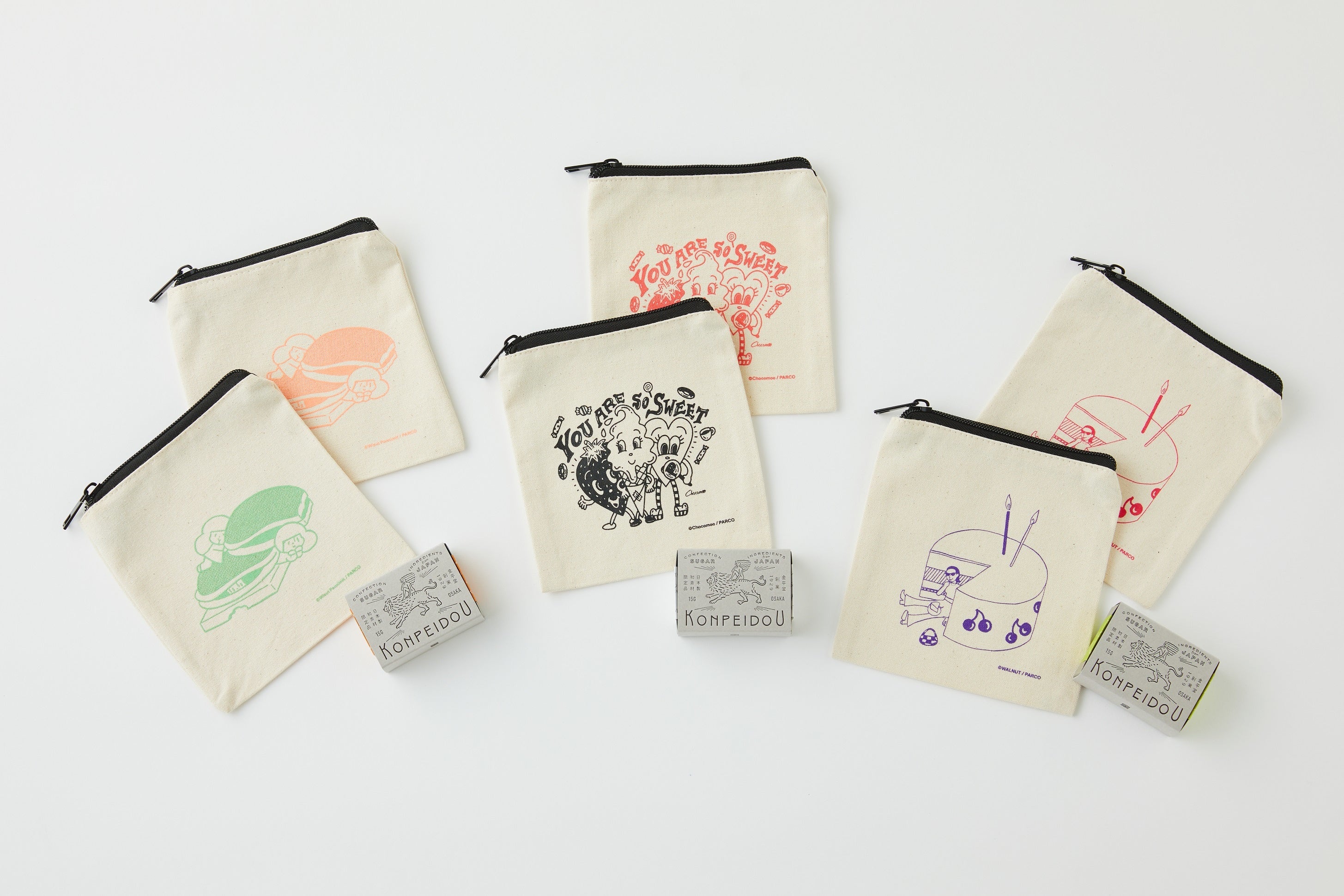 税込5,000円以上のポケパル払いご利用の方・全国1万名様限定で、人気クリエイターのイラスト入りミニポーチ&「金平堂(KONPEIDOU)の金平糖」をセットにしたプチギフトを進呈。