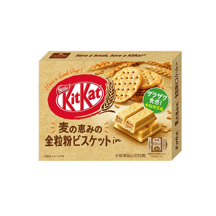 全粒粉ビスケットを練り込んだザクザク食感が楽しめる「キットカット」。香ばしい風味をお楽しみいただけます。
