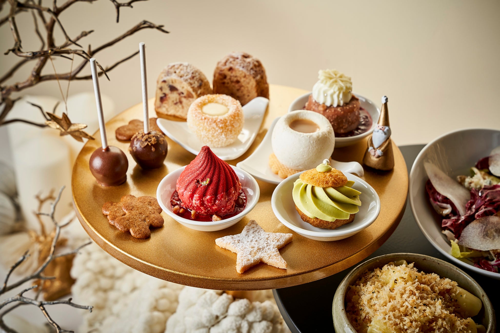 1階イタリア料理「スプレンディード」で年間を通して人気を博しているアフタヌーンブッフェ。「クリスマスの贈り物」、イタリア語で「レガーロ ディ ナターレ」をテーマに、エグゼクティブペストリーシェフ フレデリック・モローによる26種のスイーツと、イタリア・シチリア島出身の料理長ナタレ アレッシオ・ラ バルベラが手掛ける本場イタリア仕込みのセイヴォリー7種をご用意いたします。今回はクリスマスの定番スイーツ「チョコレートロールケーキ」や「ジンジャーブレッドマン」に加え、イタリア発祥といわれるチョコレート、ジャンドゥーヤを使ったくちどけが滑らかな味わいの「アーモンドジャンドゥーヤタルト」や、ほろ苦い甘さのキャラメルジャムと爽やかなオレンジチョコレートクリームが相性の良い「オレンジキャラメルチョコレートケーキ」など、バリエーション豊かなスイーツを心ゆくまでブッフェスタイルでお楽しみいただけます。ライブデザートはお客様の目の前で一つずつ仕上げる「ストロベリーショートケーキ」。しっとりときめ細やかなスポンジにミルクの風味が際立つ生クリームを重ね、ふんわりとした食感はでき立てならではの繊細なおいしさです。
