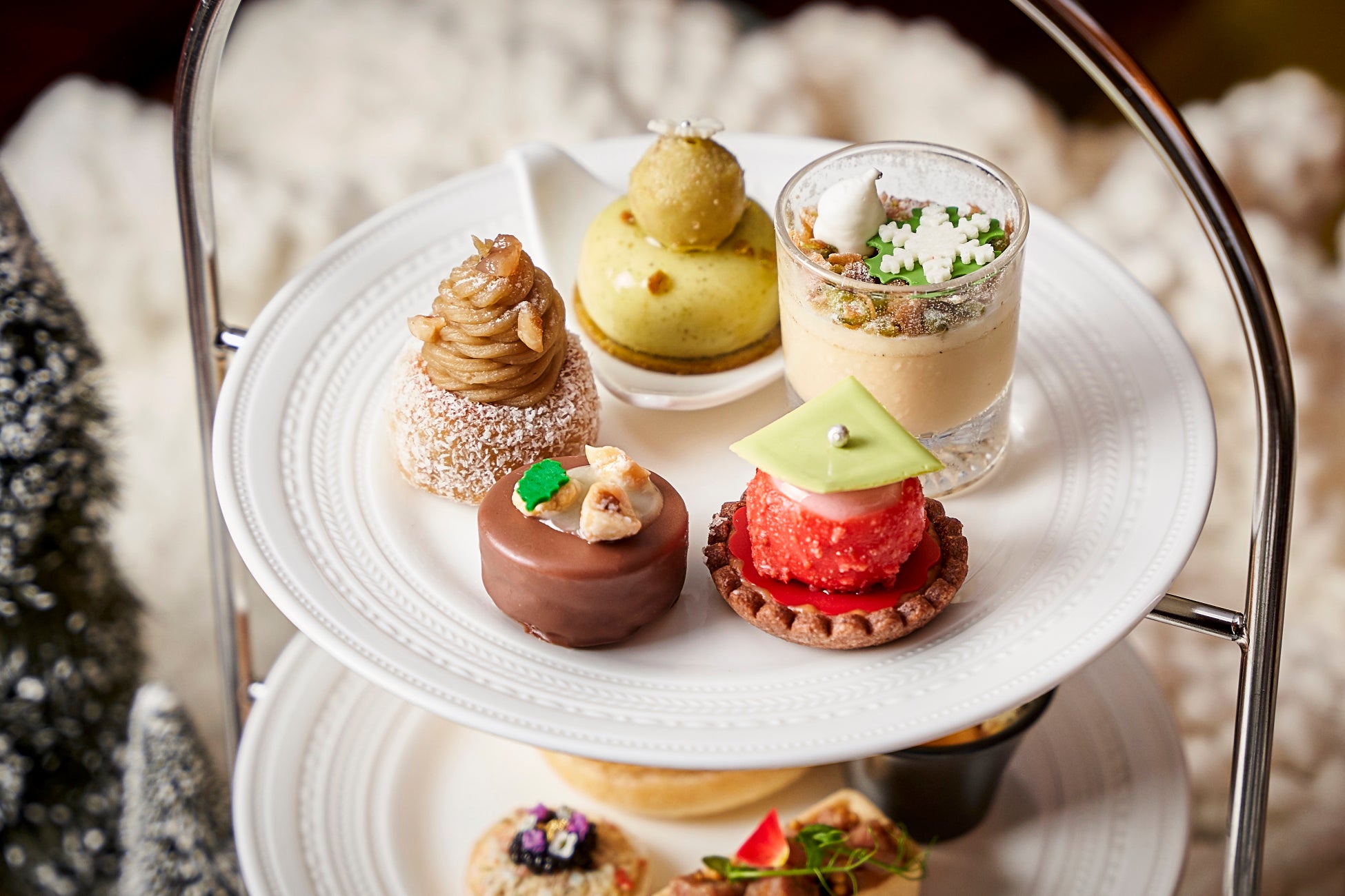 優雅な雰囲気漂う1階「ザ・ロビーラウンジ」では、フランスのクリスマスをイメージしたアフタヌーンティーをご提供いたします。フランスの人々にとってクリスマスは、年に一度離れた家族が集まったり、親しい人々と一緒に伝統的なクリスマスの料理を楽しんだりと、幸せな時間を一緒に過ごす大切な日。鮮やかな色のオーナメントやリボンで飾り付けられるクリスマスツリーは、まさに家族の絆や温かさを感じさせる特別な存在です。そんなクリスマスツリーを彩るオーナメントをイメージしたスイーツ、「バニラ柚子プリン ピスタチオフィアンティーヌ」や「栗のクリーム ミルクチョコレートシャンティ」などを、クリスマスらしいセイヴォリーと共にご提供いたします。大切な人や家族を想うこの季節、まるで素敵なオーナメントを集めたかのように美しく盛り付けられた、華やかなデザートやセイヴォリーの数々をお楽しみください。