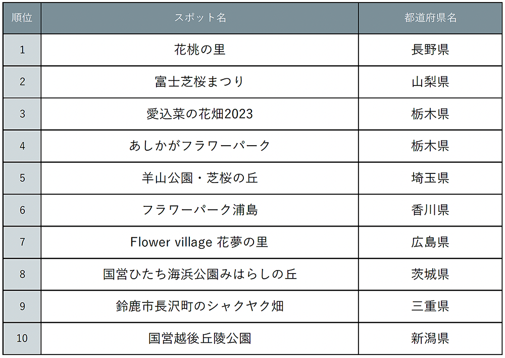 春を感じるぽかぽか陽気とともに、各地でカラフルな花が楽しめる季節が到来!今回は、春らしさを存分に感じられる「花絶景」についてアンケートを実施しました。1位は長野県「花桃の里」が獲得。静かな山里に咲く紅、白、ピンクの「三色花桃」が幻想的でまるで桃源郷のような美しさを誇るスポット。続く2位は山梨県「富士芝桜まつり」。壮大な富士山と可憐な芝桜のコラボが人気で、どの角度からも楽しめる絶景がポイント。3位には栃木県「愛込菜の花畑2023」がランクイン。一面を黄金色に染める菜の花の海を泳ぐこいのぼりは圧巻の光景。そのほか、藤やネモフィラ、シャクヤク、チューリップなど多彩でカラフルな花絶景が楽しめるスポットが多数ランクインする結果となりました。