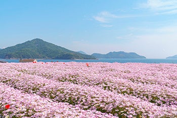 瀬戸内海の春の陽気も心地よく、可憐な白のマーガレットが畑一面を埋め尽す様は、まるで絵本の中に入り込んだような気分に浸ることができる。真っ青な空や海と花のコラボは感動の美しさで、花畑からは、浦島太郎の伝説が残る荘内半島の段々畑や瀬戸大橋まで望める。