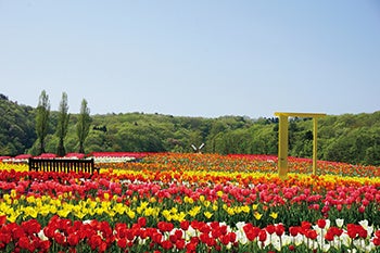 春には厳しい冬を乗り越えたチューリップが丘一面を彩り、中には色・形の特徴的なチューリップが揃う「品種紹介コーナー」も。早咲きや遅咲きを色彩バランスよく組み合わせているため、長い期間楽しめる。花の中に設置した黄色いドアなど撮影ポイントも見逃せない。