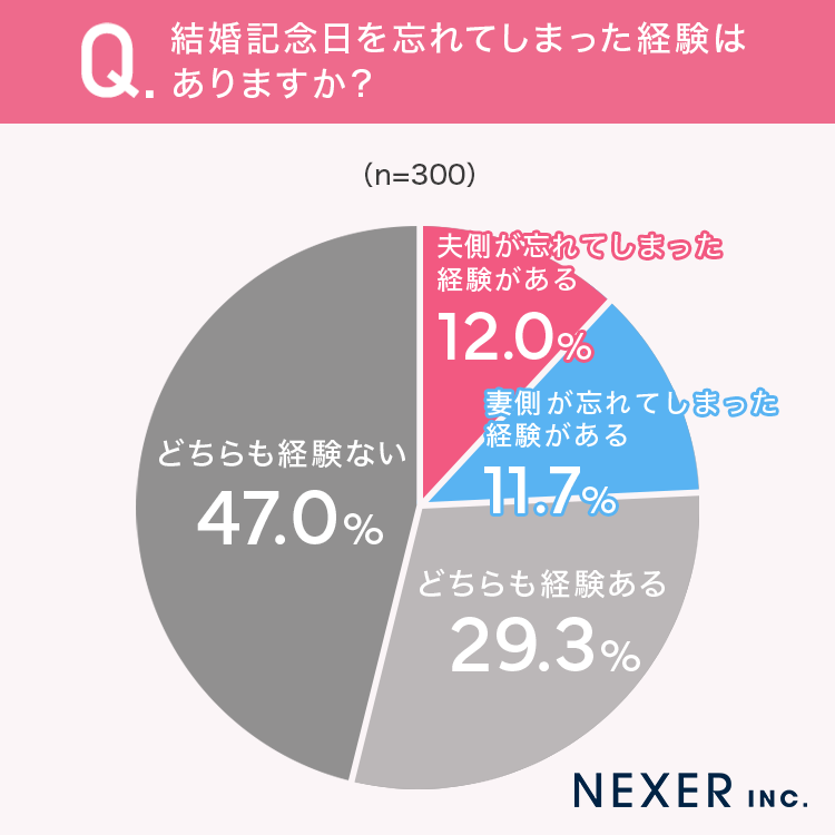 一方で、12%は夫側が、11.7%は妻側が、29.3%は夫も妻も両方が忘れてしまった経験があると回答しました。