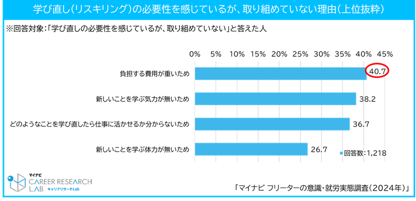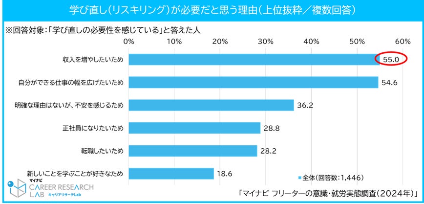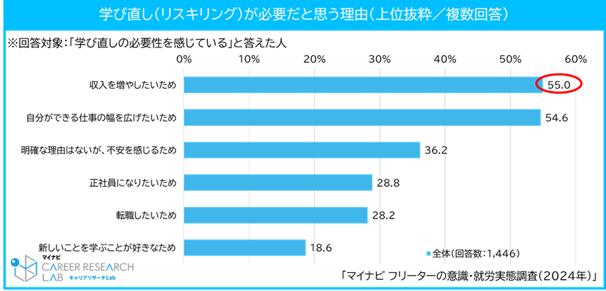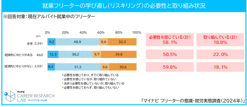 フリーターの8割以上が「経済的にゆとりがない」と感じている。約6割が「学び直しが必要」と感じるも、実態は2割に留まる。学び直しの目的は「収入確保」が最多な一方で、負担する費用が壁に。