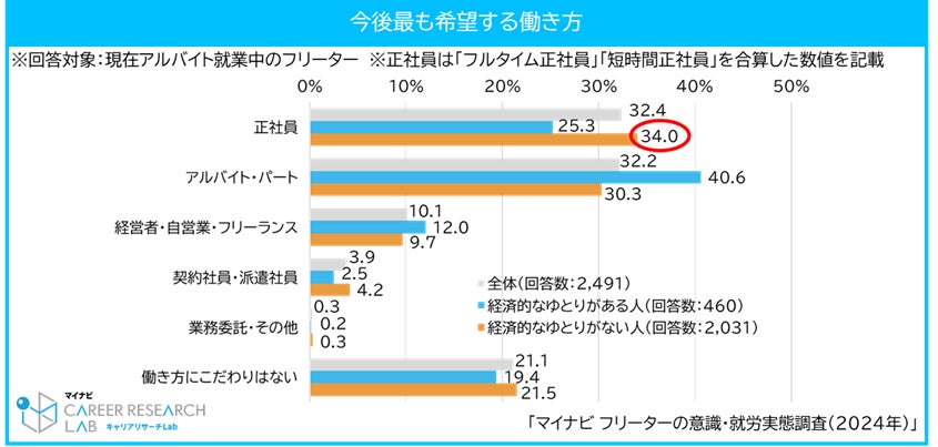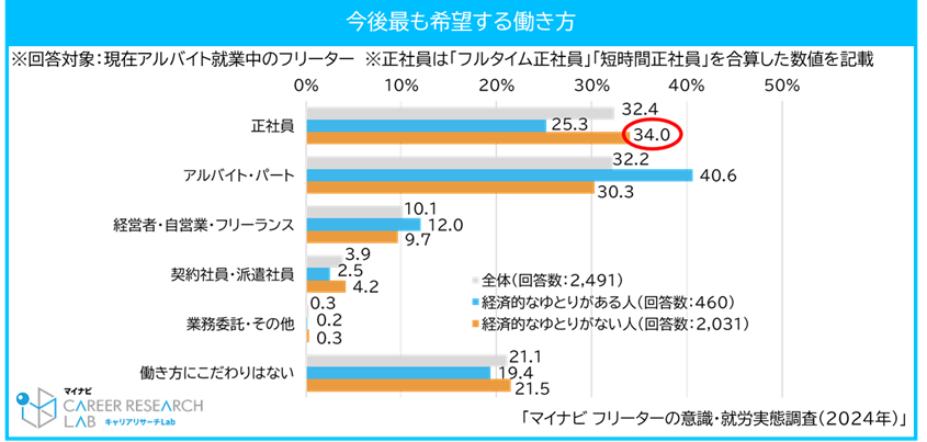 今後最も希望する働き方を聞いたところ、「正社員」が最多で32.4%、次いで「アルバイト・パート」が32.2%だった。経済的なゆとりの有無別でみると、[経済的なゆとりがない]と回答した人は[経済的なゆとりがある]と回答した人より正社員を希望する割合が8.7pt高く、34.0%となった。