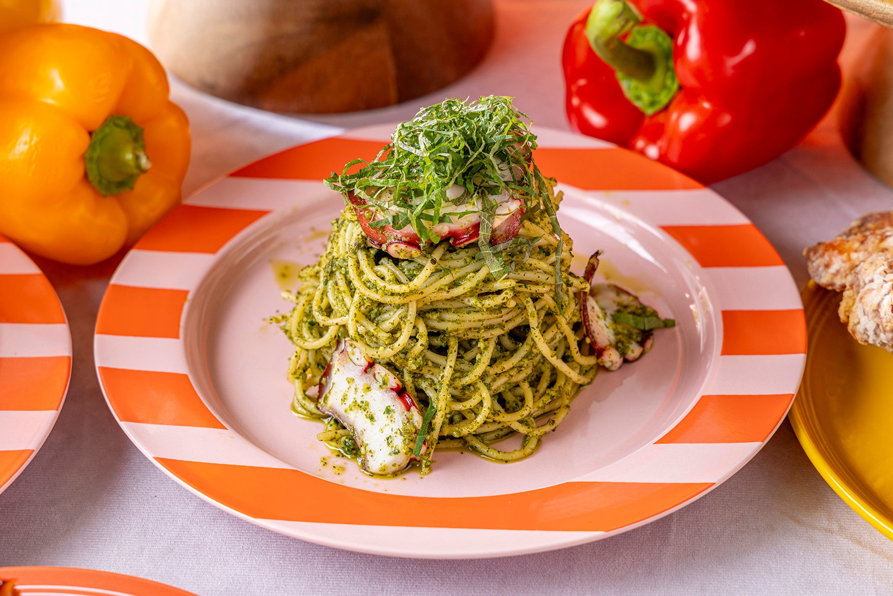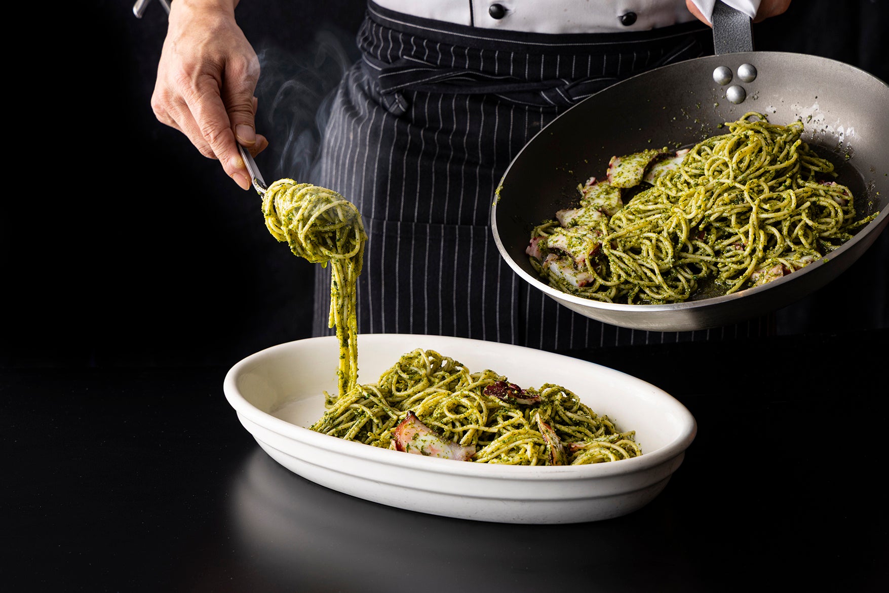 ランチタイムには、ライブコーナーにて6種の生パスタをご提供します。「タコと大葉のジェノベーゼ」「ホタルイカ&菜の花とセミドライトマト」「桜エビ&パンチェッタのピンクカルボナーラ」など、和の食材とイタリアンの技法を掛け合わせたメニューが並びます。成田名物のうなぎを使った「鰻&山芋のバルサミコソース」は、ふっくらしたうなぎと山芋の食感にバルサミコの酸味を重ねた一皿です。