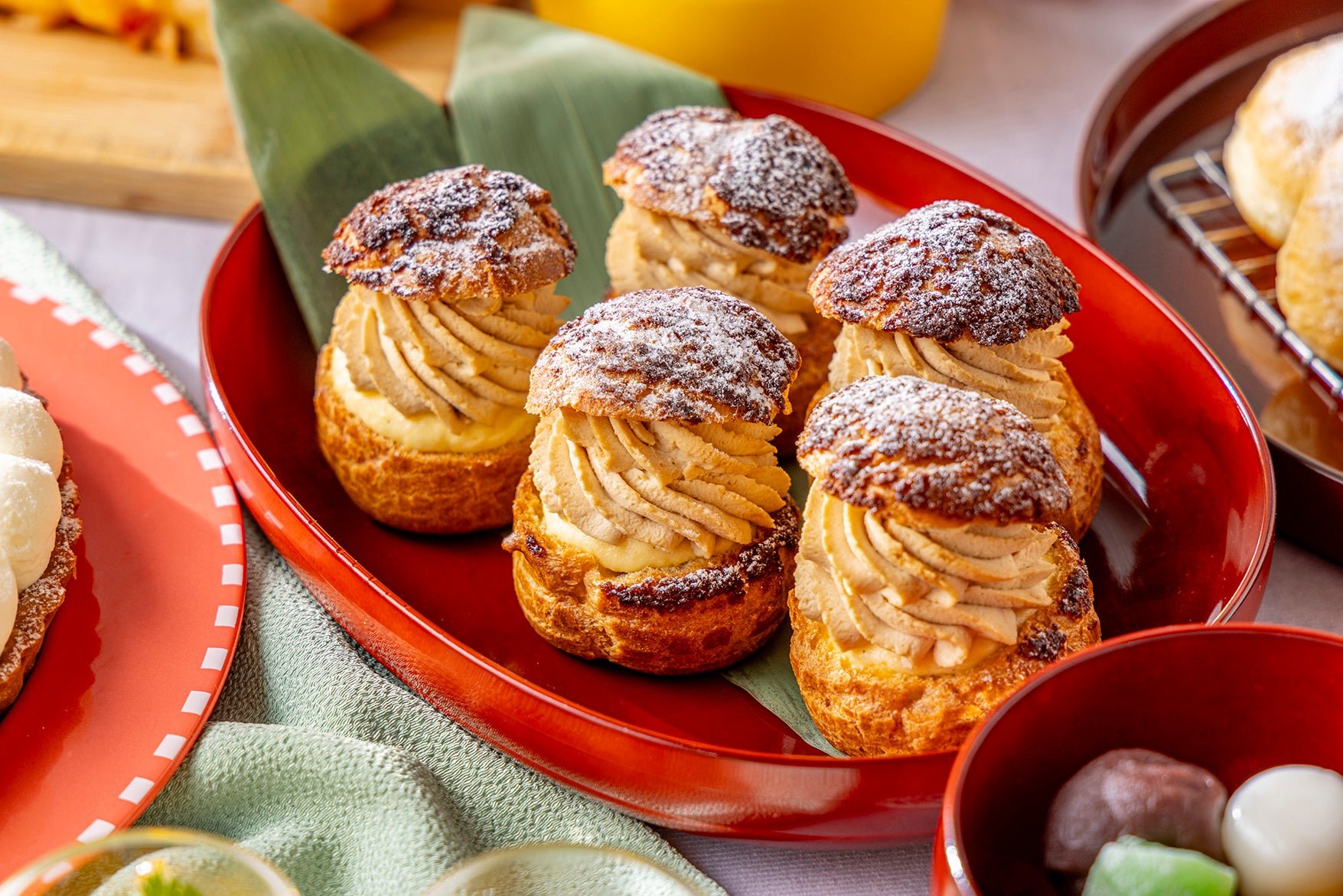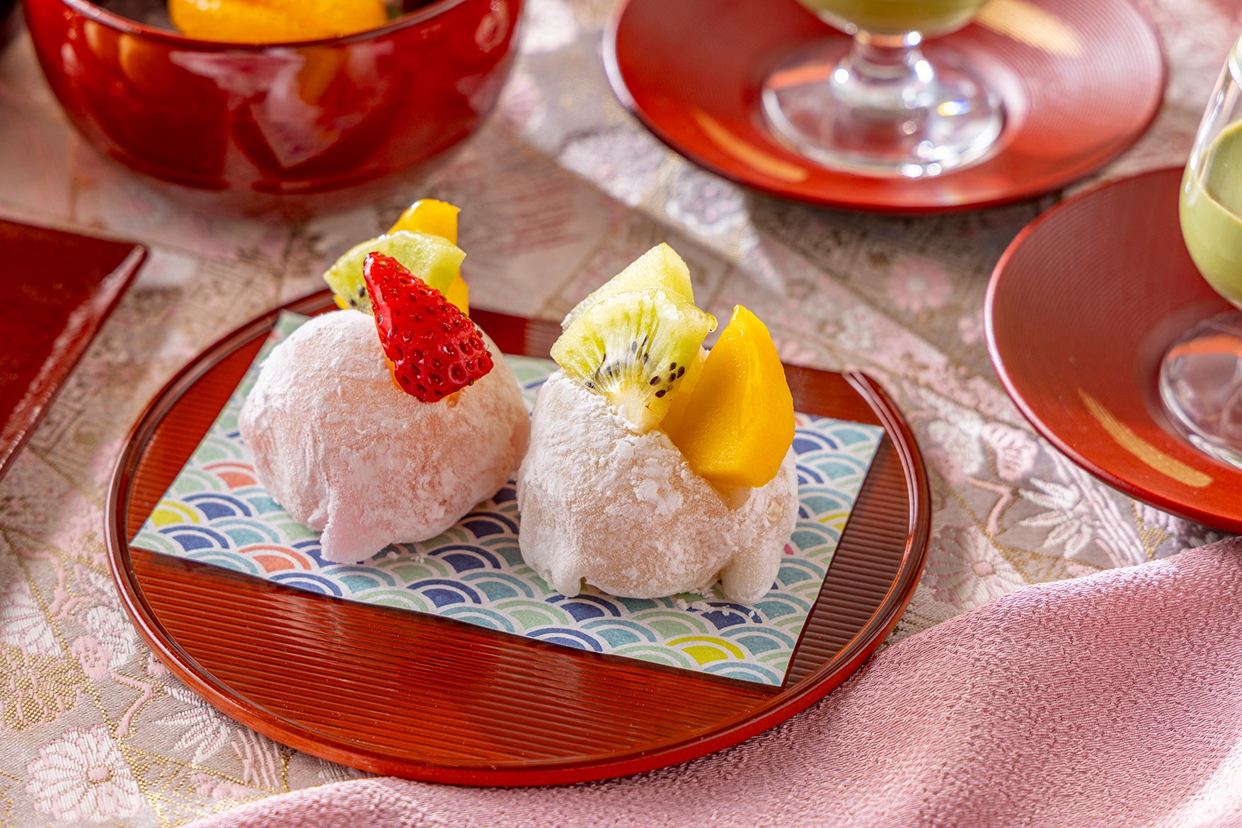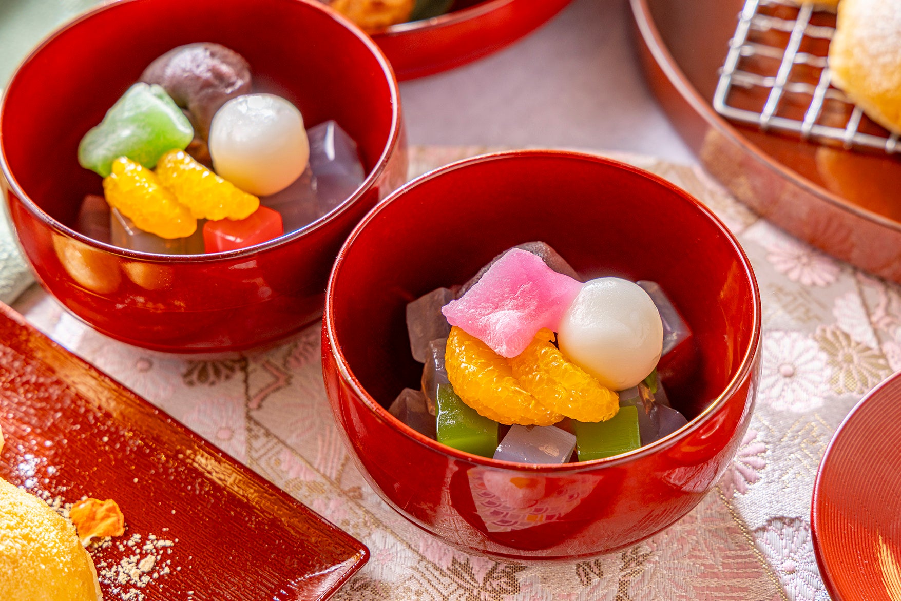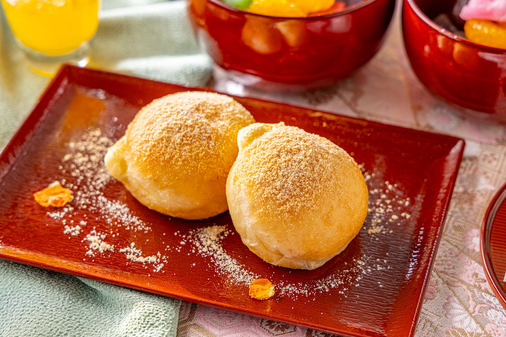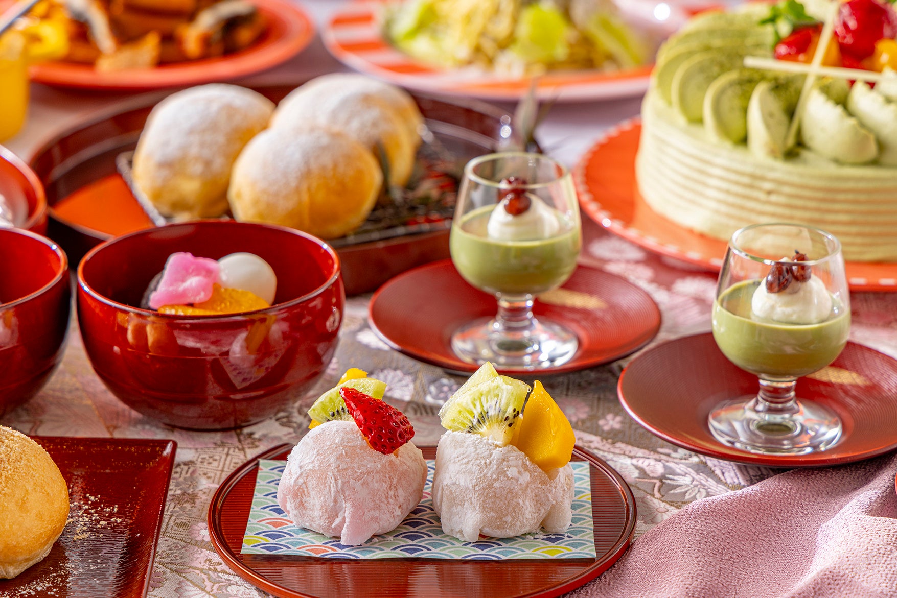 デザートコーナーには、和の素材を生かしたスイーツが並びます。ランチタイムには、イタリアの定番菓子を和風にアレンジした「きなこのボンボローニ」が登場。さらに5月7日からは、平日限定で「フルーツ大福」も加わります。そのほか「抹茶のショートケーキ」「抹茶プリン」「白玉あんみつ」「モンブランタルト」「黒糖シュークリーム」など、多彩なラインアップをご用意しております。