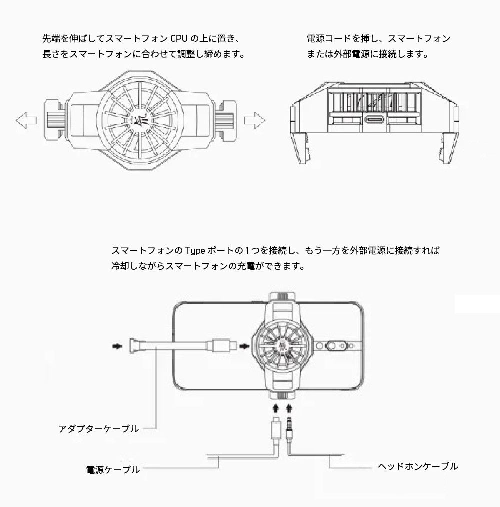 ⚫︎USB-Cケーブル接続で稼働、ケーブル接続でスマホ充電をしながら冷却ができる
