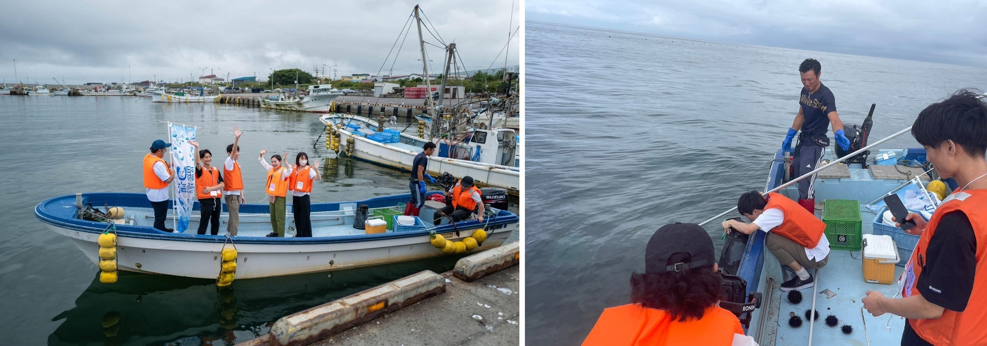 森町・掛澗漁港に到着した参加者は、まず地元の漁師 坂本晃太さんから、磯焼けの現状を聞いた後、漁船に乗船。磯焼けの現場へと向かいます。現場では、実際にタモでウニを捕る体験も行われました。参加者からは「海の底をのぞくとウニしかおらず、磯焼けの深刻さがわかった」「そこに見えているウニだけど、捕るのは難しかった。ウニの駆除には専門技能がいるのだなと思った」などの感想が聞かれました。