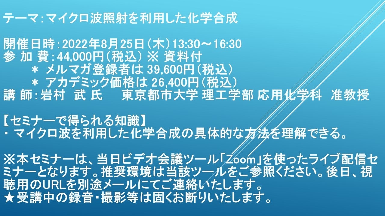 先端技術情報や市場情報を提供している(株)シーエムシー・リサーチ(千代田区神田錦町: https://cmcre.com/ )では、 各種材料・化学品などの市場動向・技術動向のセミナーや書籍発行を行っておりますが、 このたび「マイクロ波照射を利用した化学合成」と題するセミナーを、 講師に岩村 武 氏 東京都市大学 理工学部 応用化学科 准教授)をお迎えし、2022年8月25日(木)13:30より、 ZOOMを利用したライブ配信で開催いたします。 受講料は、 一般:44,000円(税込)、 弊社メルマガ会員:39,600円(税込)、 アカデミック価格は26,400円(税込)となっております(資料付)。