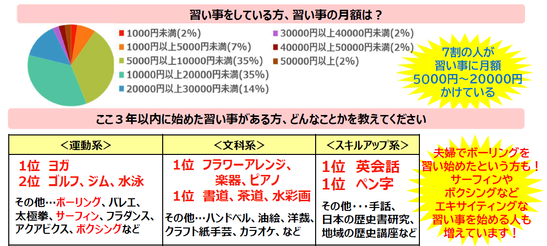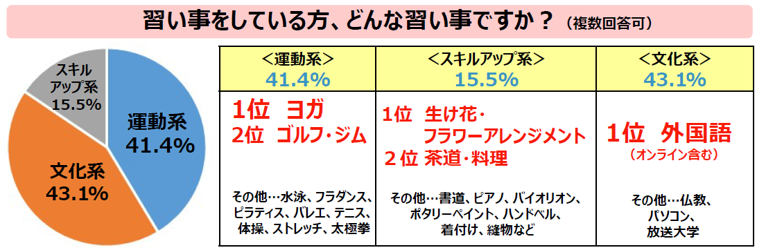 アンケートの結果、運動系の習い事をしている人は全体の41.4%、文科系は43.1%、スキルアップ系は15.5%という割合に。運動系の中で人気が高い習い事は、ヨガ、ゴルフ、ジム、文科系では生け花やフラワーアレンジメントが一番人気で、続いて茶道、料理、書道、ピアノ。スキルアップ系では、外国語が最も人気がありました。