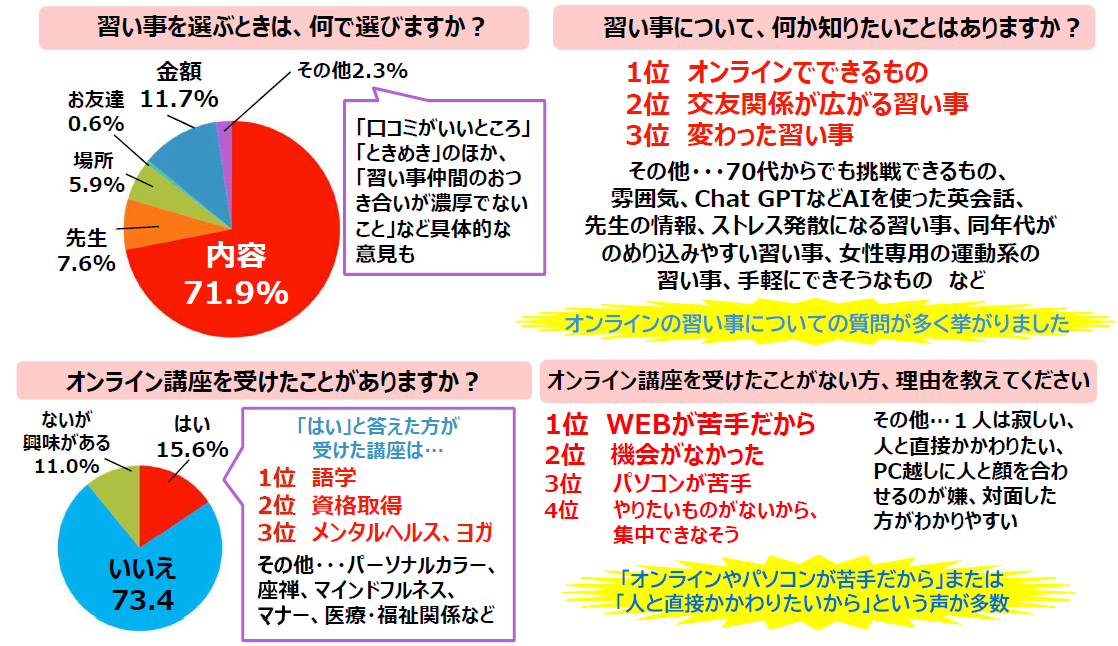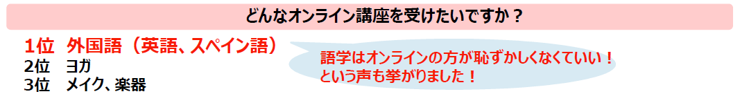 オンライン講座を受けたことがある人は全体の15.6%と少なく、受けたことがない理由としては、「オンラインが苦手だから」という声が多く挙がりました。しかし、習い事について何か知りたいことがありますか? という質問では、「オンラインでできるものについて知りたい」がトップとなり、また、「どんなオンライン講座を受けたいですか?」という質問では、1位は「外国語」という結果でした。