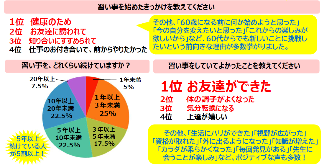 「習い事をしていてよかったこと」は、「友人ができたこと」が最も多く、続いて「健康になった」「気分転換になる」との回答結果に。また、「外国の人と話せるようになった」「毎週大笑いできるようになった」「先生に会うことが楽しみ」と、習い事をすることにより人生が楽しく豊かになったという声も多く聞かれました。