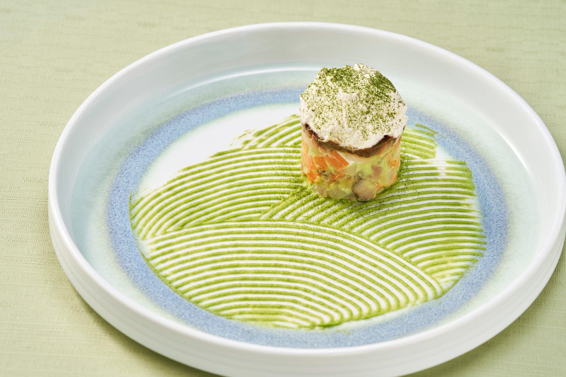 「フレンチダイニング トップ オブ キョウト」ではランチコース「トゥルネ」のオードブル「“茶源郷の景観” 和束産 抹茶風味のサラダマセドワンヌ 京の地豆腐 久在屋 京ふたりのエスプーマ」にて、和束町の豊かな自然と茶源郷の風景を表現した逸品をお愉しみいただけます。新緑が広がる風景や茶葉が育まれる土地の豊かな風土を連想させる、本フェアを象徴する一品に仕上げました。