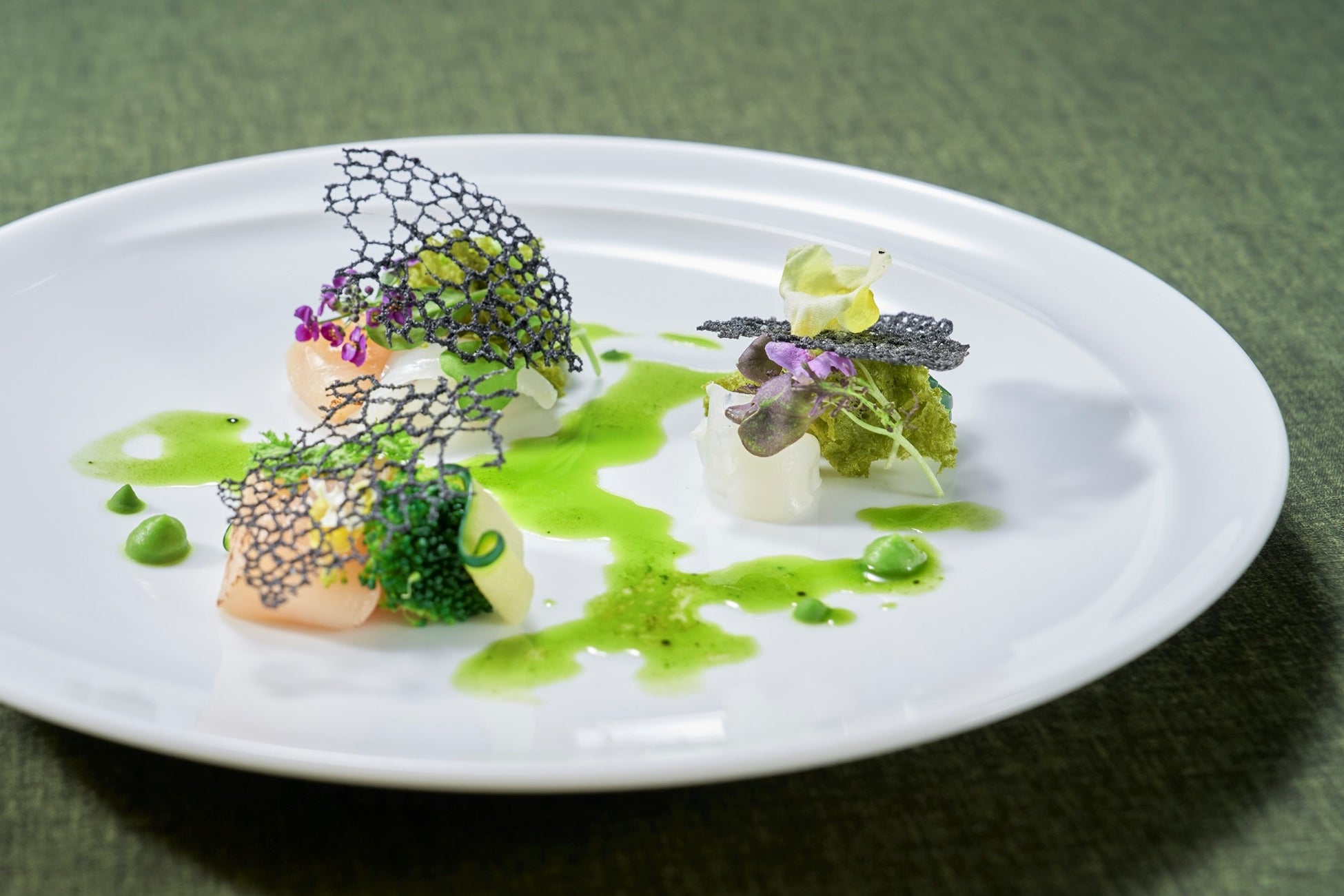 ・帆立貝とコウイカの炙り “宇治和束町”抹茶のビネグレット