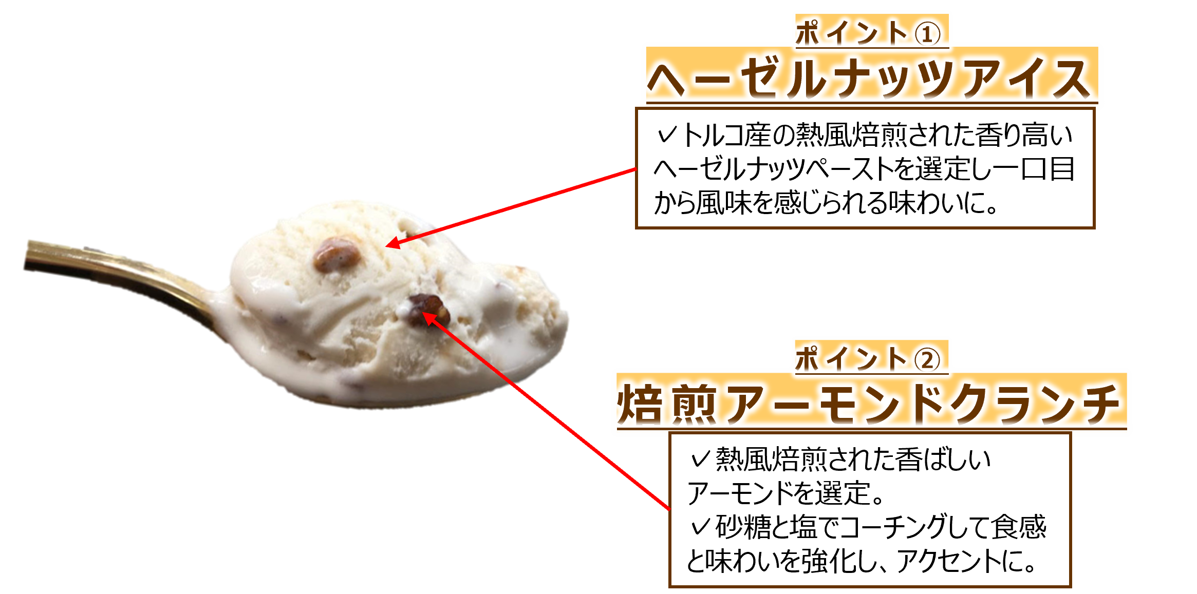 - 香り高いヘーゼルナッツアイスに、シュガーコーチングした食感も楽しい焙煎アーモンドを混ぜ込んだ、ナッツのコク深く香ばしい濃厚な味わいを楽しめるミニカップです。