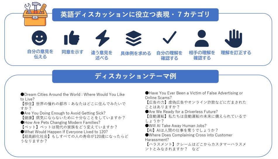 衣食住からAI、自動運転、カスタマーハラスメントといった現代の諸問題まで、50のディスカッションテーマをセレクトしました。また、自分の意見を伝える、同意を示す、理解を確認するといった「ディスカッションで役立つ7カテゴリ30表現」を繰り返し学ぶことで、対話力を高めます。