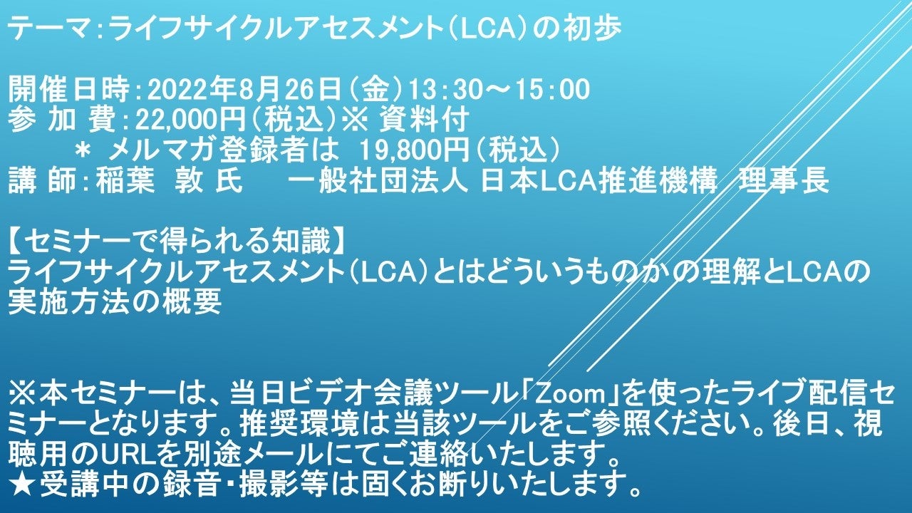 先端技術情報や市場情報を提供している(株)シーエムシー・リサーチ(千代田区神田錦町: https://cmcre.com/ )では、 各種材料・化学品などの市場動向・技術動向のセミナーや書籍発行を行っておりますが、 このたび「ライフサイクルアセスメント(LCA)の初歩」と題するセミナーを、 講師に稲葉 敦 氏 一般社団法人 日本LCA推進機構 理事長)をお迎えし、2022年8月26日(金)13:30より、 ZOOMを利用したライブ配信で開催いたします。 受講料は、 一般:22,000円(税込)、 弊社メルマガ会員:19,800円(税込)となっております(資料付)。