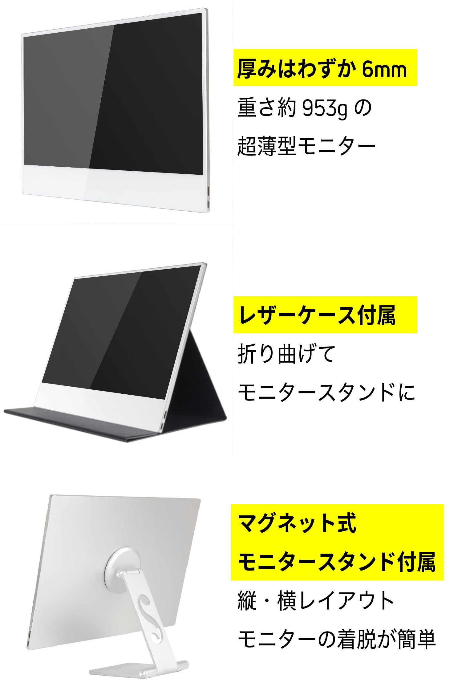 【モニタースタンド・レザーケース付/厚みわずか6mm、重量約953g/薄型ベゼル/10点マルチタッチ対応/8ビットカラーならではの豊かな色彩/MiniHDMI入力/USB-C入力&パススルー充電対応】