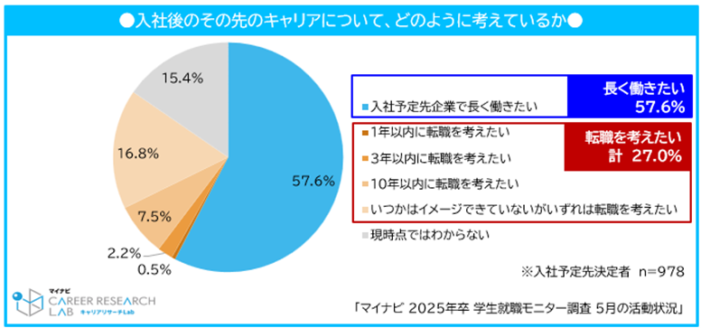 入社後のキャリアについて聞くと、「入社予定先企業で長く働きたい」が57.6%で最も多く、転職を視野に入れている学生は27.0%*2だった。