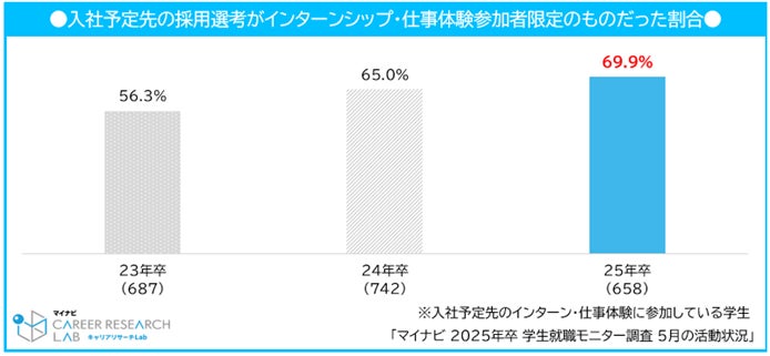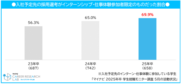 しかし、5月末時点で入社予定先を決めている学生のうち、入社予定先企業の採用選考がインターンシップ・仕事体験参加者限定だったと回答した割合は約7割という結果でした。インターンシップ等を通じて得た学生の情報を採用選考活動に利用できるのは、採用活動開始の6月以降と定められています。今後も配慮ある採用活動を期待したいと思います。