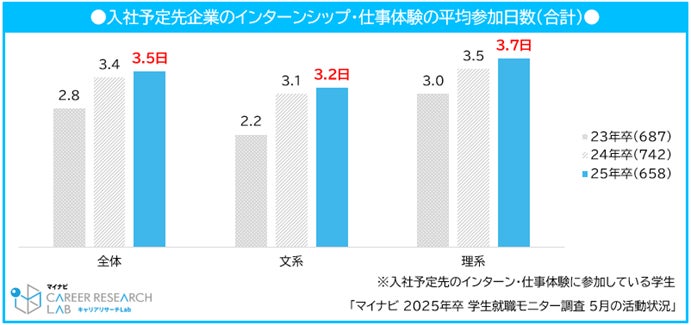 入社予定先のインターンシップ・仕事体験に参加した割合は65.3%(前年比2.2pt増)で、2年連続で増加した。平均の参加日数は、全体では3.5日(前年比0.1日増)と増加傾向で、その要因として三省合意によるインターンシップの定義改正の影響が考えられる。文理別にみると文系が3.2日に対し、理系は3.7日と、約半日長い結果となった。