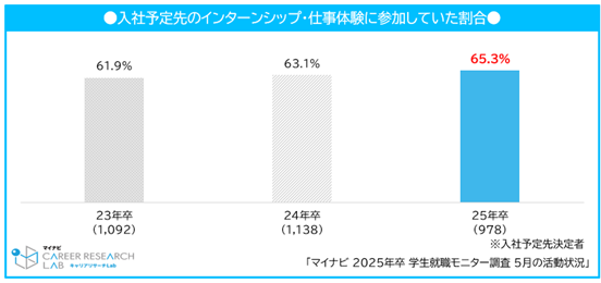 予定先のインターンシップ・仕事体験に参加した割合は65.3%で2年連続増加。