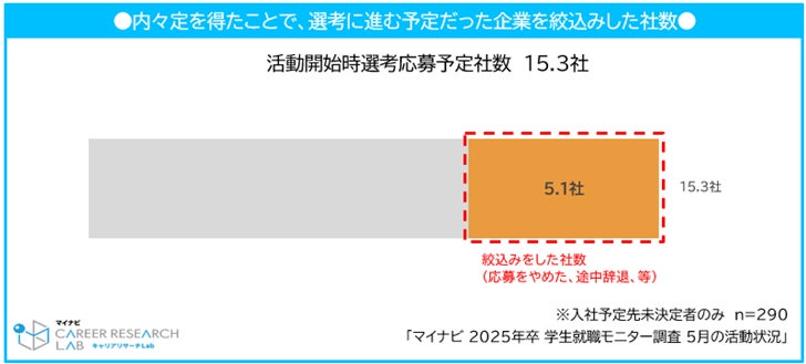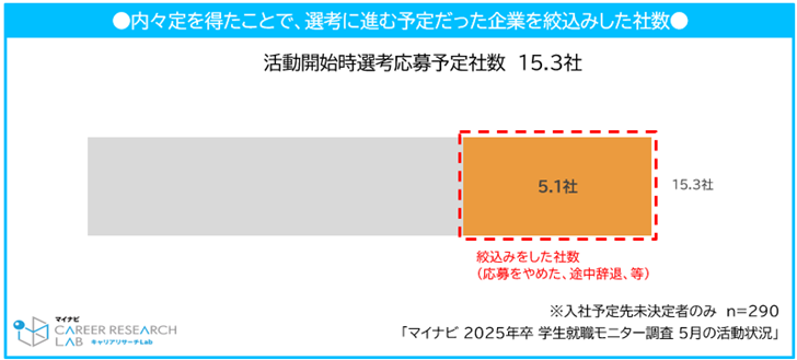 入社予定先が未決定の学生に、内々定を得たことでその後の選考を受ける企業を絞り込んだかを聞くと、「内々定を得た企業より志望度の高い企業のみに絞った(48.3%)」が最多となり、合計で85.0%の学生が選考を受ける企業の絞込みをしていることがわかった。また、活動開始時の選考応募予定社数は平均で15.3社だったが、内々定を得たことで応募をやめたり、選考を辞退した企業は5.1社と、約3分の1の企業の選考を中止していることがわかった。【図4、5、6】