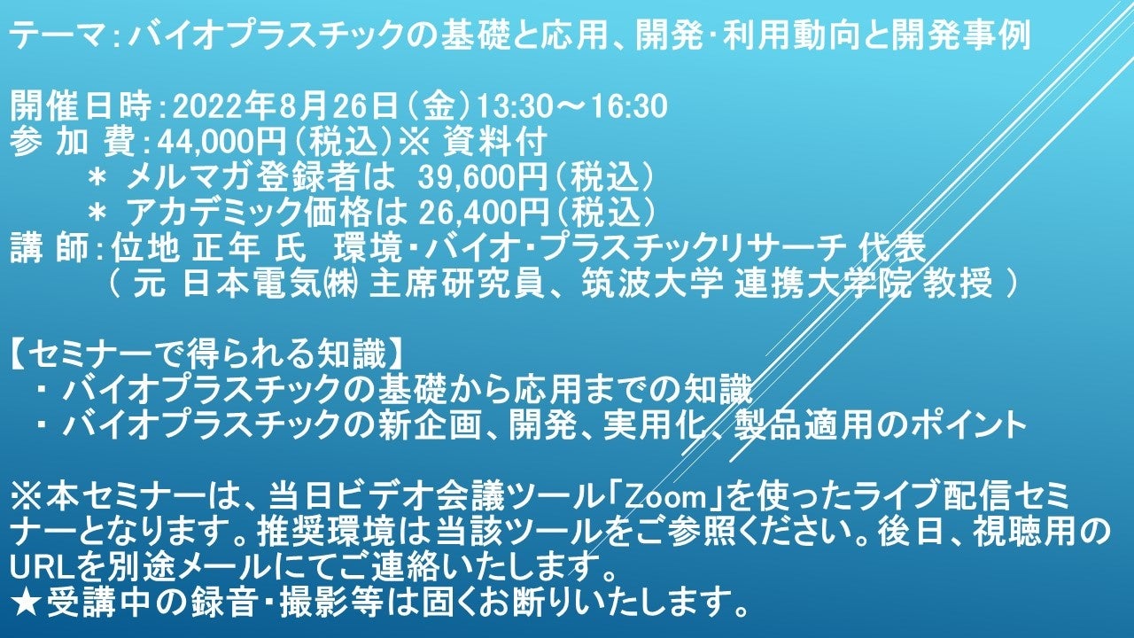 先端技術情報や市場情報を提供している(株)シーエムシー・リサーチ(千代田区神田錦町: https://cmcre.com/ )では、 各種材料・化学品などの市場動向・技術動向のセミナーや書籍発行を行っておりますが、 このたび「バイオプラスチックの基礎と応用、開発・利用動向と開発事例」と題するセミナーを、 講師に位地 正年 氏 環境・バイオ・プラスチックリサーチ 代表 ( 元 日本電気(株)主席研究員、 筑波大学 連携大学院 教授 ))をお迎えし、2022年8月26日(金)13:30より、 ZOOMを利用したライブ配信で開催いたします。 受講料は、 一般:44,000円(税込)、 弊社メルマガ会員:39,600円(税込)、 アカデミック価格は26,400円(税込)となっております(資料付)。