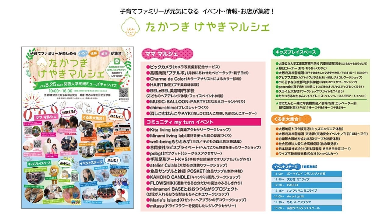 子育て世代が楽しめるイベント・情報・お店が、関西大学高槻ミューズキャンパスに集結!「第2回 たかつきけやきマルシェ」8月25日(日) 開催