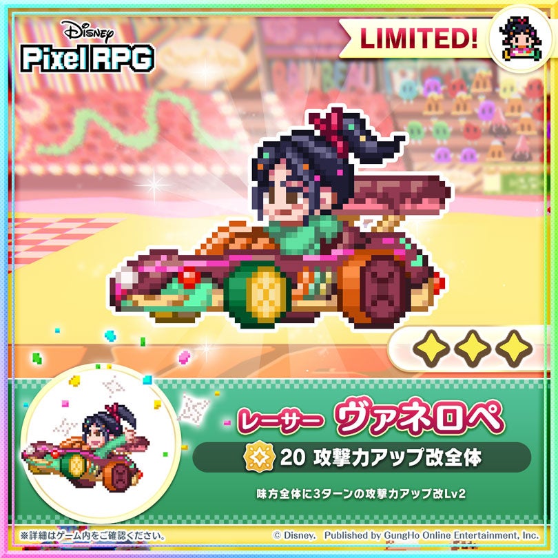 「Rescue Signal:シュガー・ラッシュ セントラルレーシング」の開催にあわせて、新キャラクター「レーサー ヴァネロペ」、「レーサー ラルフ」がラインナップされた期間限定ガチャが登場中です。どちらのキャラクターも、バトルでの活躍はもちろん、「ステージクリア時の獲得RSポイントを増加させる」という、本イベント期間限定のアビリティを持ったキャラクターとなっています。この機会にぜひ仲間にして、お気に入りのキャラクターたちと一緒に冒険へ出かけましょう。