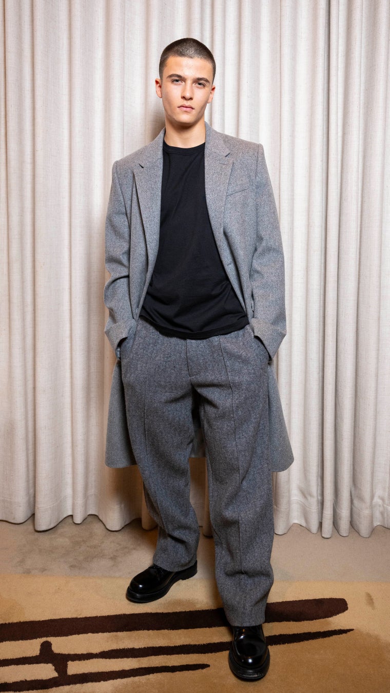 マリク・フリカは、2024年スプリング「ディオール アイコンズ」カプセルコレクションから、グレーのカシミヤクロスコートにブラックのコットンTシャツ、グレーの「ディオール オブリーク」ジャカード カシミヤとウールのジャージートラックスーツを纏い、シルバーのブラスリング、ブラックレザーの「ディオール カルロ」ダービーシューズを合わせました。