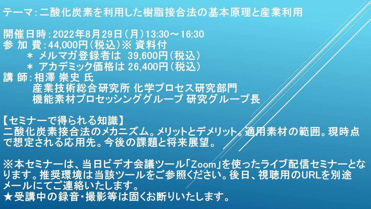 先端技術情報や市場情報を提供している(株)シーエムシー・リサーチ(千代田区神田錦町: https://cmcre.com/ )では、 各種材料・化学品などの市場動向・技術動向のセミナーや書籍発行を行っておりますが、 このたび「二酸化炭素を利用した樹脂接合法の基本原理と産業利用」と題するセミナーを、 講師に相澤 崇史 氏 産業技術総合研究所 化学プロセス研究部門 機能素材プロセッシンググループ 研究グループ長)をお迎えし、2022年8月29日(月)13:30より、 ZOOMを利用したライブ配信で開催いたします。 受講料は、 一般:44,000円(税込)、 弊社メルマガ会員:39,600円(税込)、 アカデミック価格は26,400円(税込)となっております(資料付)。