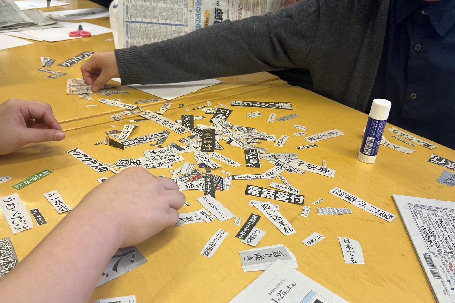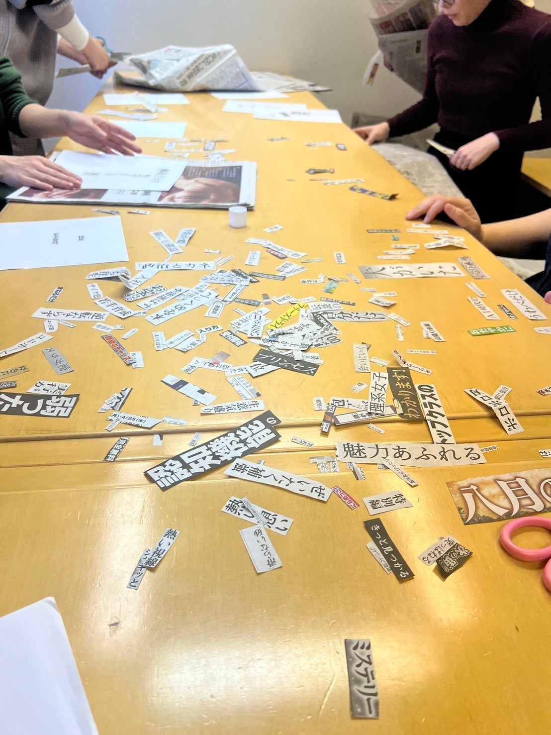 ・ついつい「は」や「を」など「てにをは」を一字だけ切り取って使いたくなるが、そこはグッと我慢。必ず3枚の切り抜きで作る。