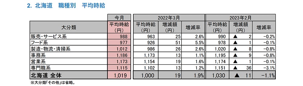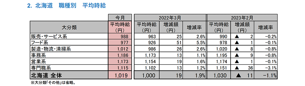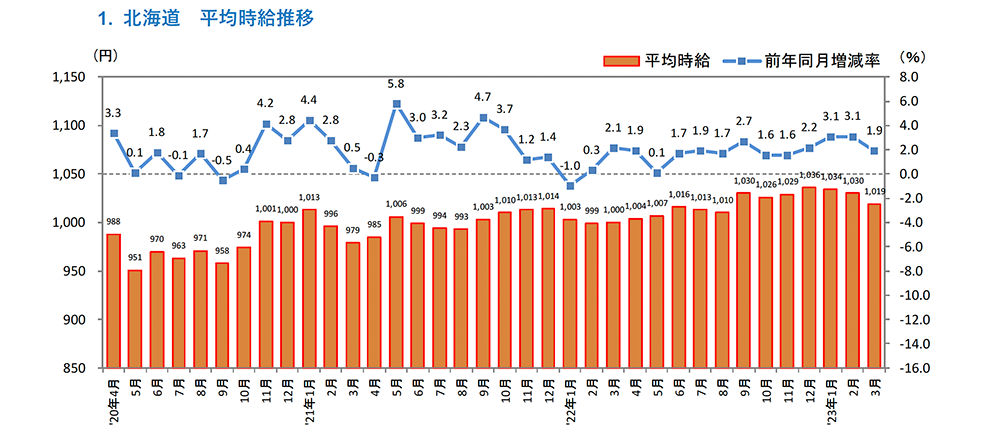 [北海道版]2023年3月度 アルバイト・パート募集時平均時給調査 北海道の3月度平均時給は前年同月より19円増加の1,019円