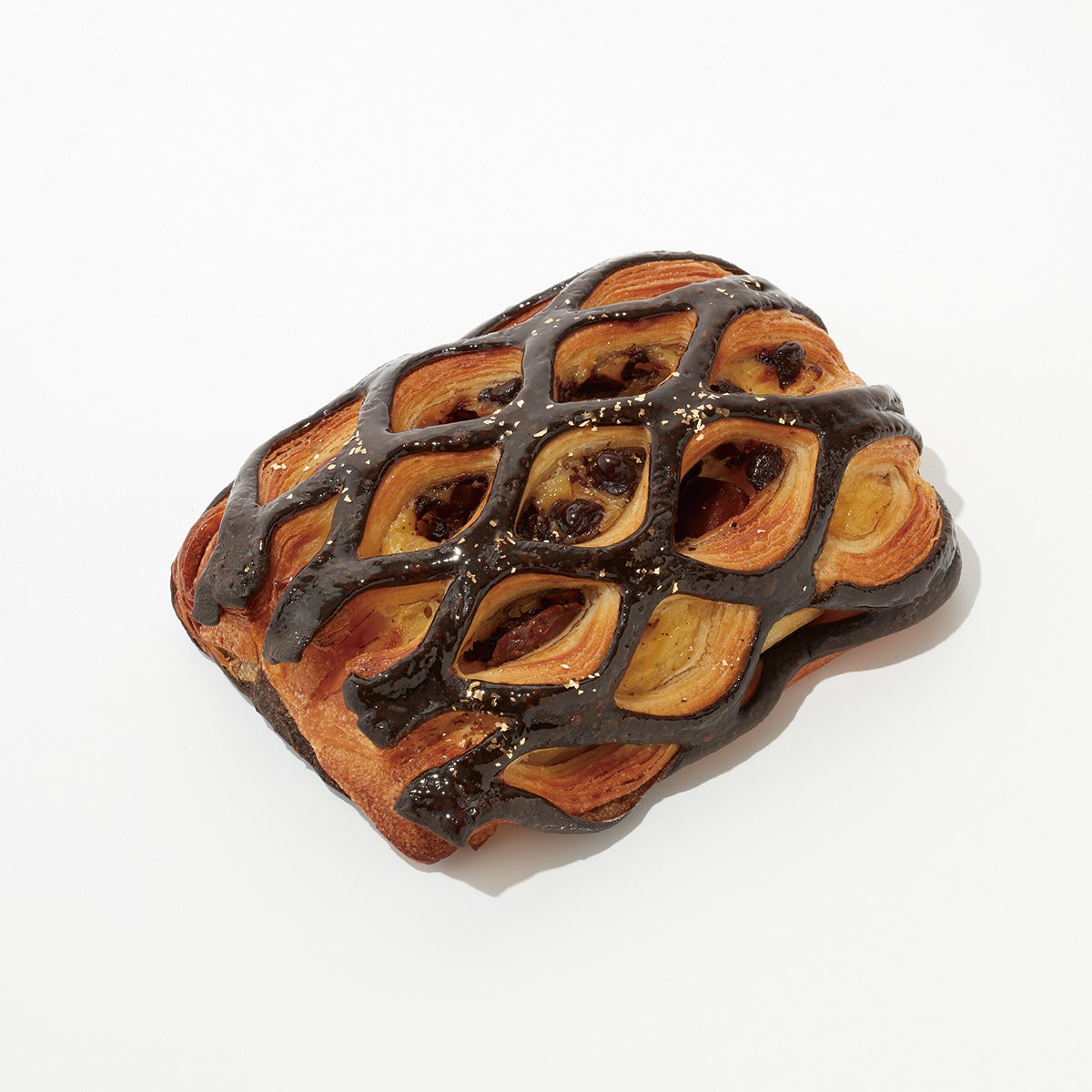 2色のマーブル状の生地に、カスタード、マカダミアナッツ、チョコチップを網目状に包み焼き上げました。