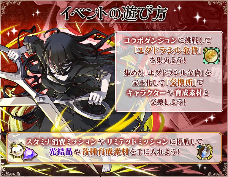 本コラボ期間中のログインで、新たなコラボキャラクター「第五階層領域守護者ニグレド」が手に入ります。本キャラクターは、ダンジョンのクリア報酬などで入手できる「【宝玉】ユグドラシル金貨」を集めて、交換所でも追加獲得することが可能です。
