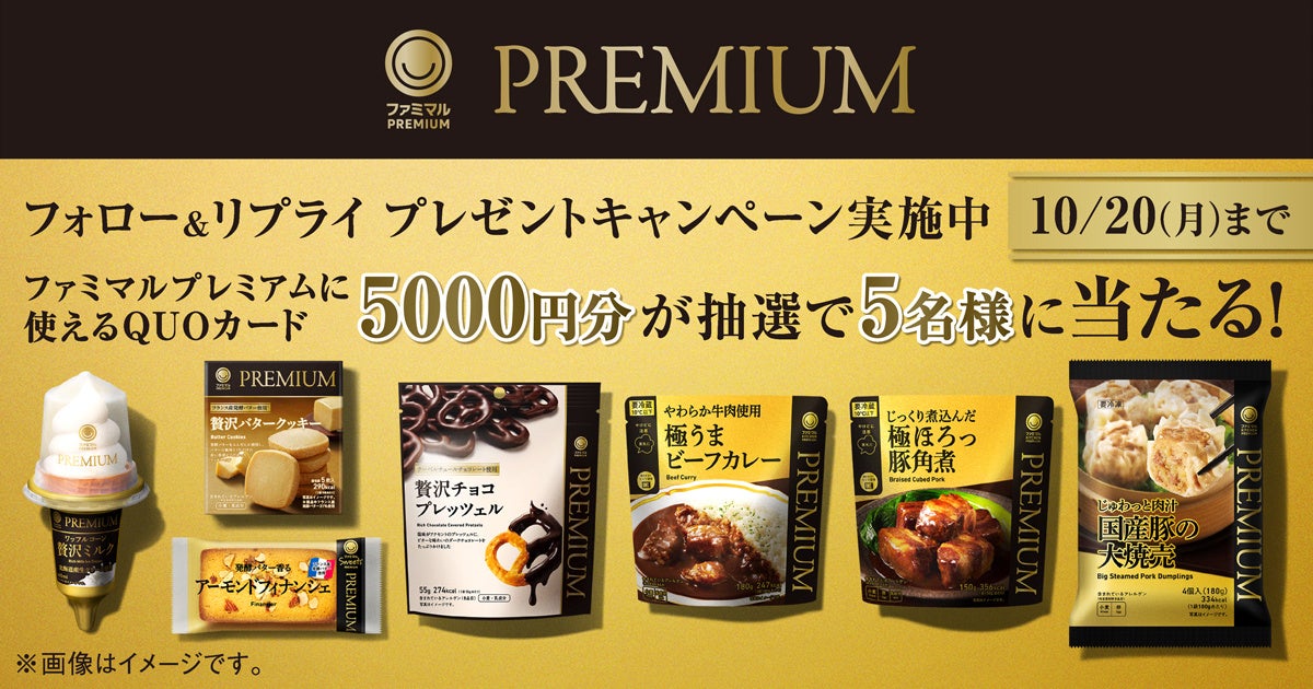 ファミリーマート公式X(@famima_now)をフォローのうえ、ファミリーマート公式Xからの対象の投稿に「#ファミマルプレミアム食べてみたい」とつけて、食べてみたいファミマルプレミアム商品名をリプライしていただくと、抽選で5名さまにQUOカード5,000円分が当たります。