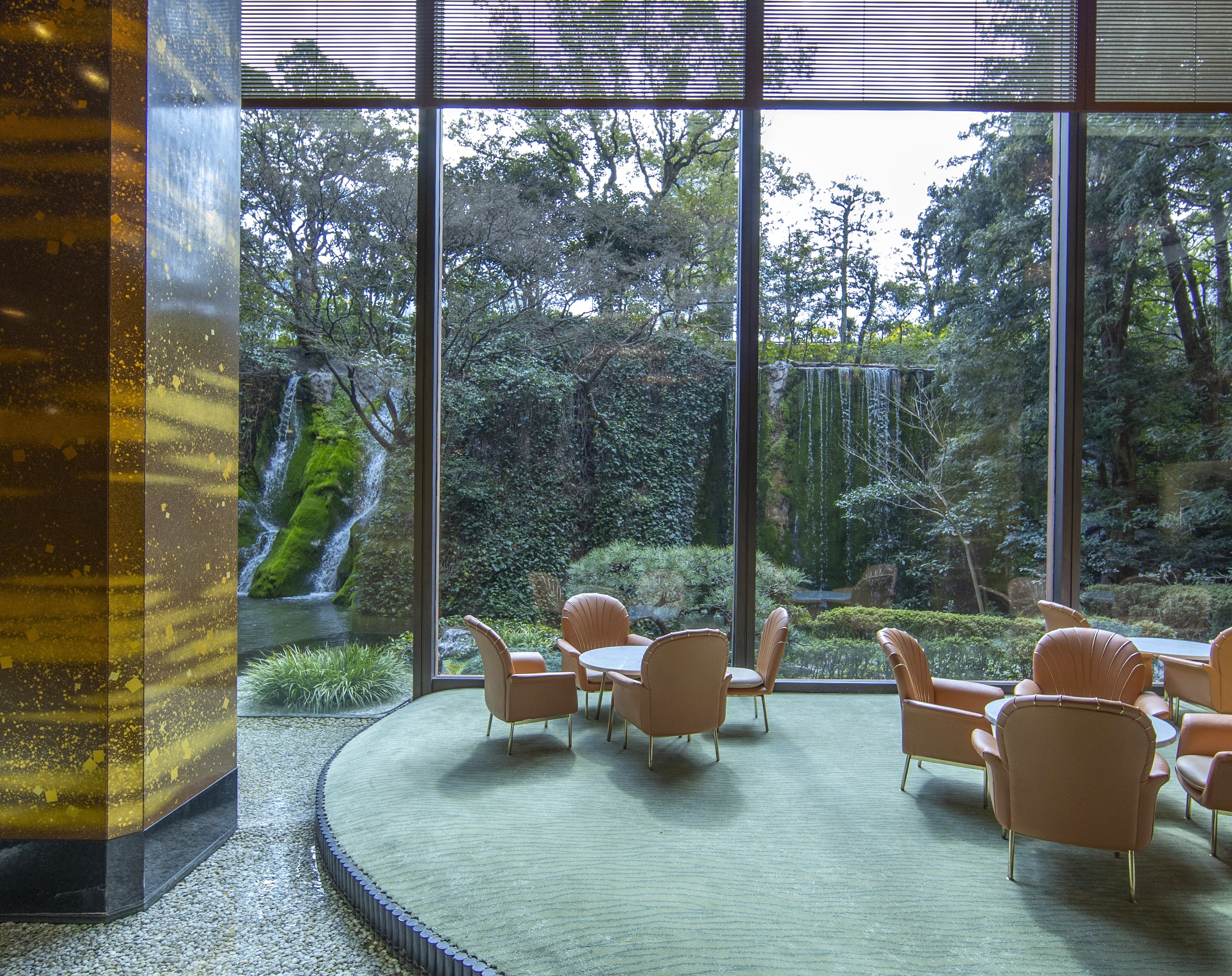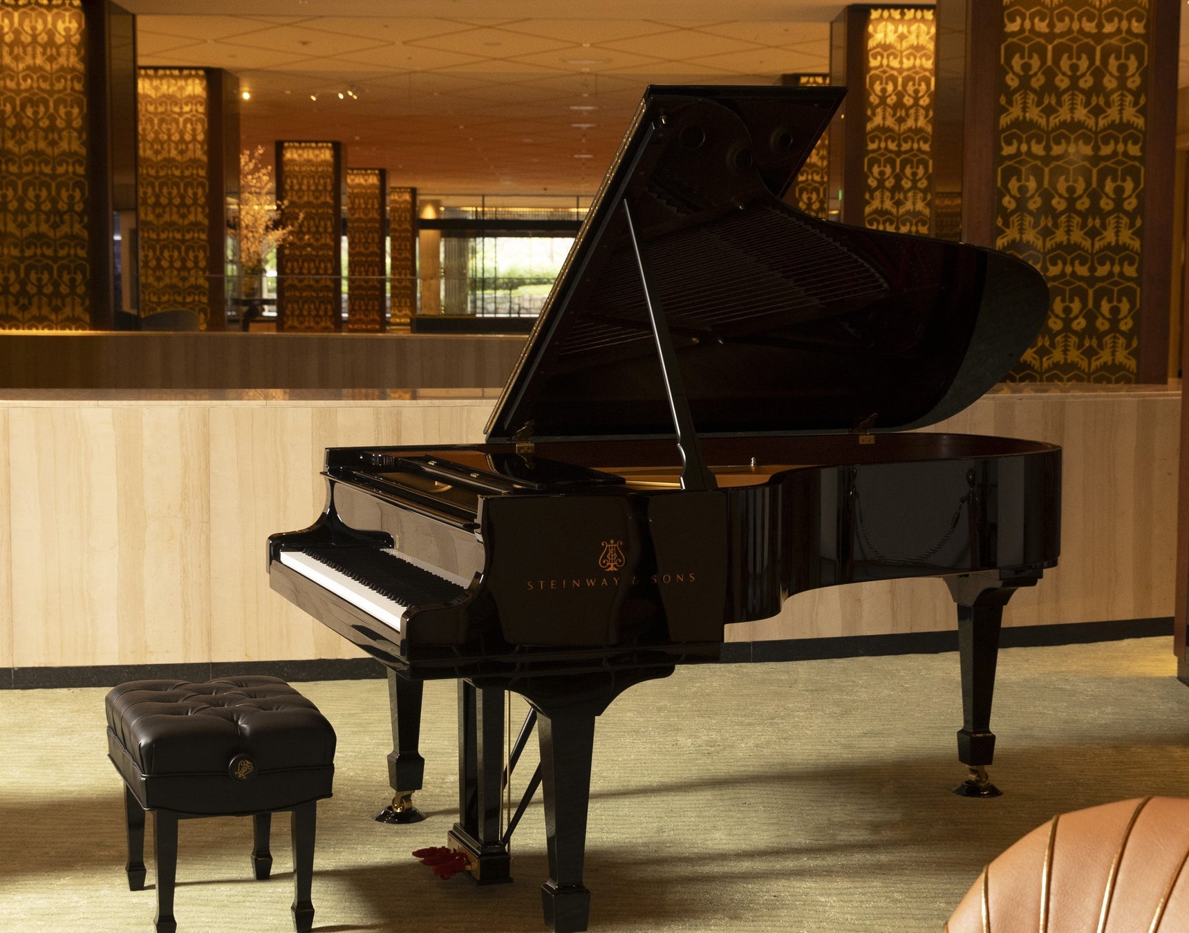 「メインラウンジ」は、大きな窓から四季折々の姿を見せる日本庭園を望む、ゆったりとした時間が流れる和空間です。名画伯たちの絵画や、約25万個のクリスタルガラスを用いた「紫雲」をイメージしたシャンデリアが、非日常の世界へと誘います。またこの度、スタインウェイ&サンズの「SPIRIO」を日本のホテルで初めて導入し、トップピアニストの名演を再現する音楽体験を提供しています。「曲水の宴」を模した水の回廊が奏でる心地よいせせらぎと、ピアノの音色に包まれながら、五感で日本文化を愉しむ優雅なひとときをお楽しみください。