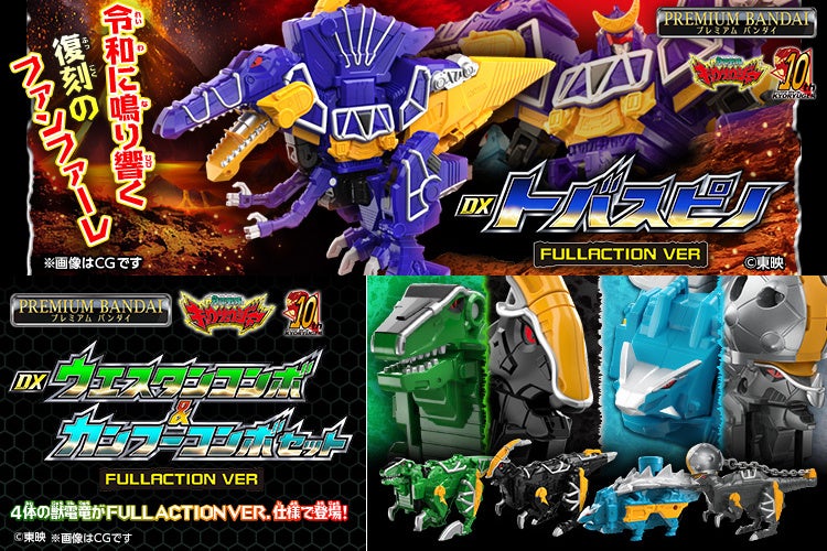 放送10周年『獣電戦隊キョウリュウジャー』より、「DXトバスピノ」と「DXウエスタンコンボ&カンフーコンボセット」がFULLACTION VERで登場。